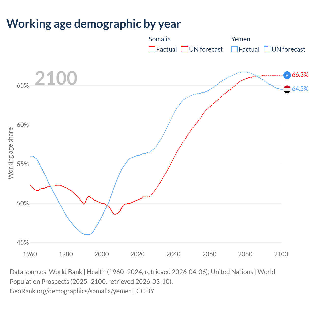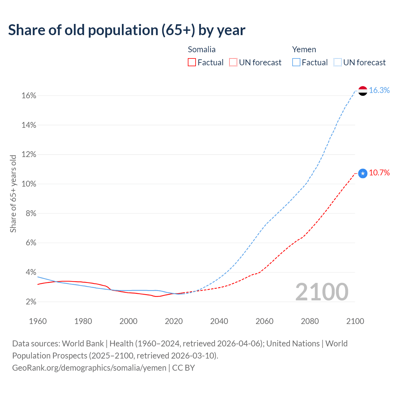 The share of older people aged 65 and over is 2.59% in Somalia and 2.52% in Yemen. Life expectancy in Somalia compared to Yemen .