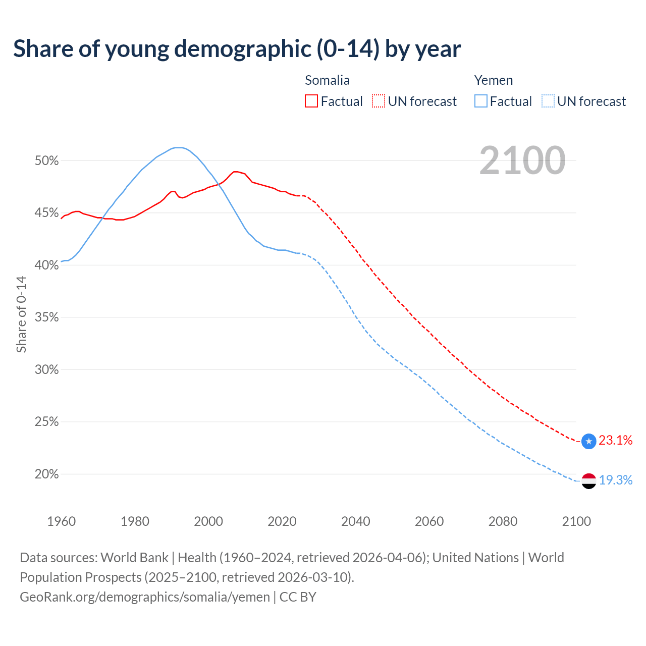 - The share of young demographic (0-15 years old) in Somalia is 46.6% vs 41.1% in Yemen.