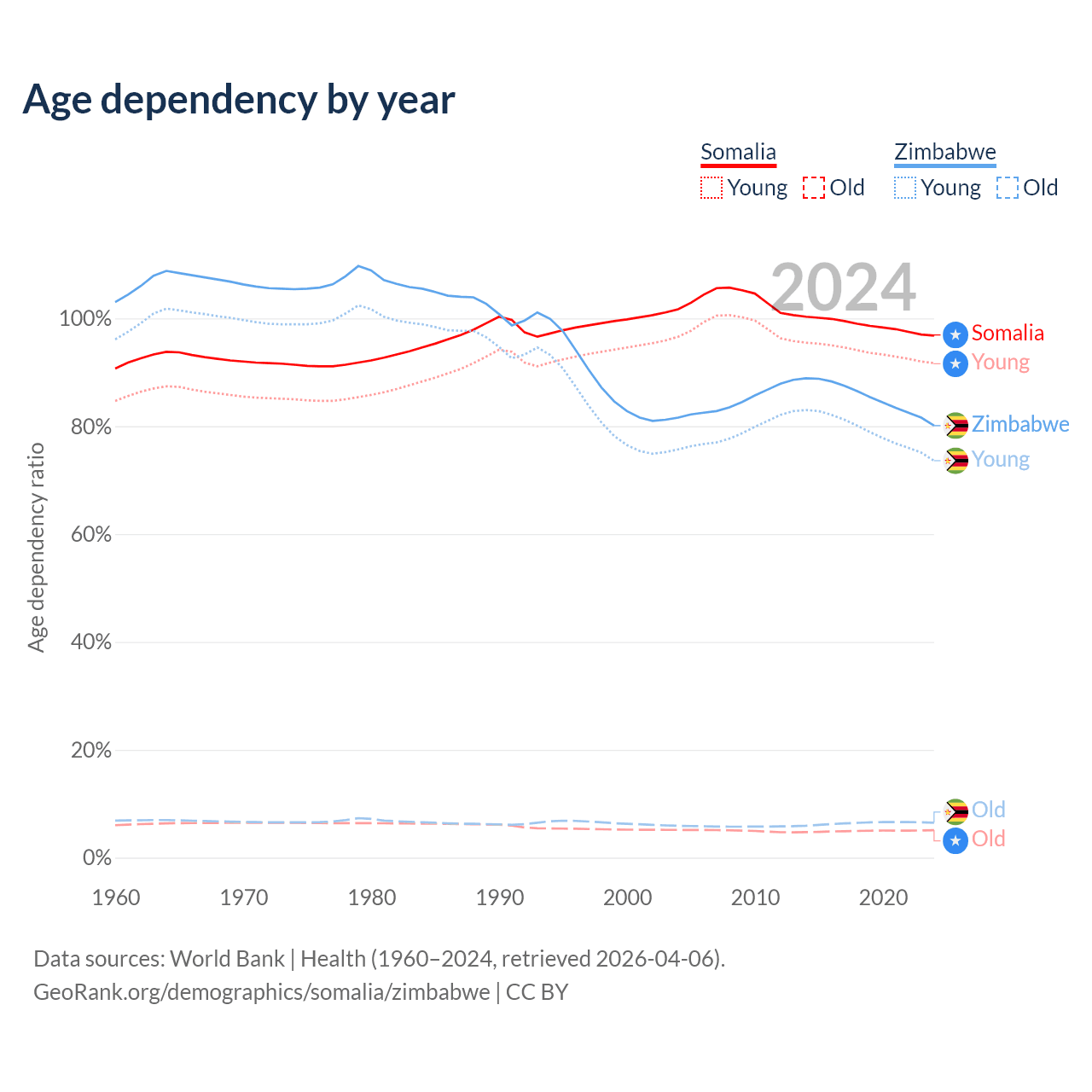 - Somalia is ranked 194/196 by median age (oldest to youngest) vs 177/196 for Zimbabwe.