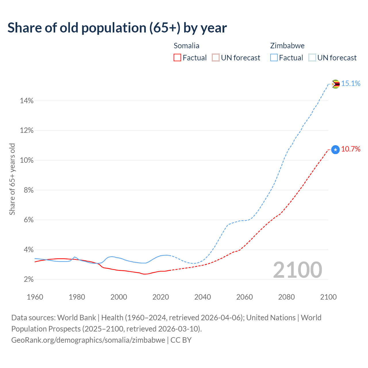 The share of older people aged 65 and over is 2.59% in Somalia and 3.6% in Zimbabwe. Life expectancy in Somalia compared to Zimbabwe .