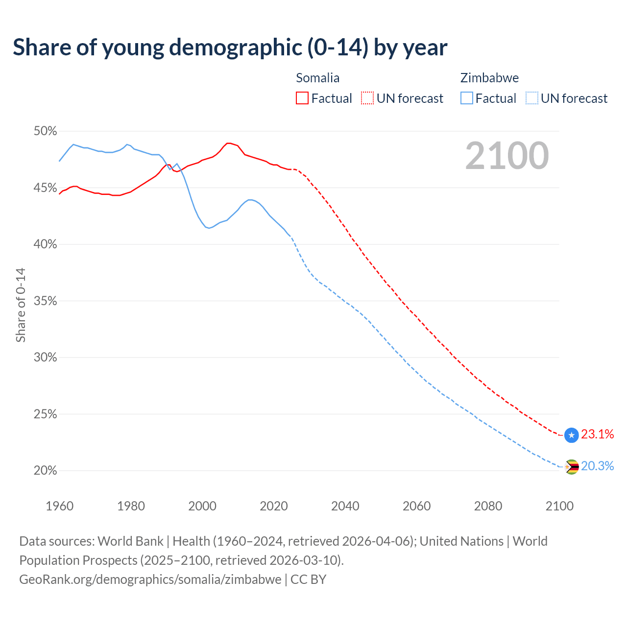 - The share of young demographic (0-15 years old) in Somalia is 46.6% vs 40.9% in Zimbabwe.