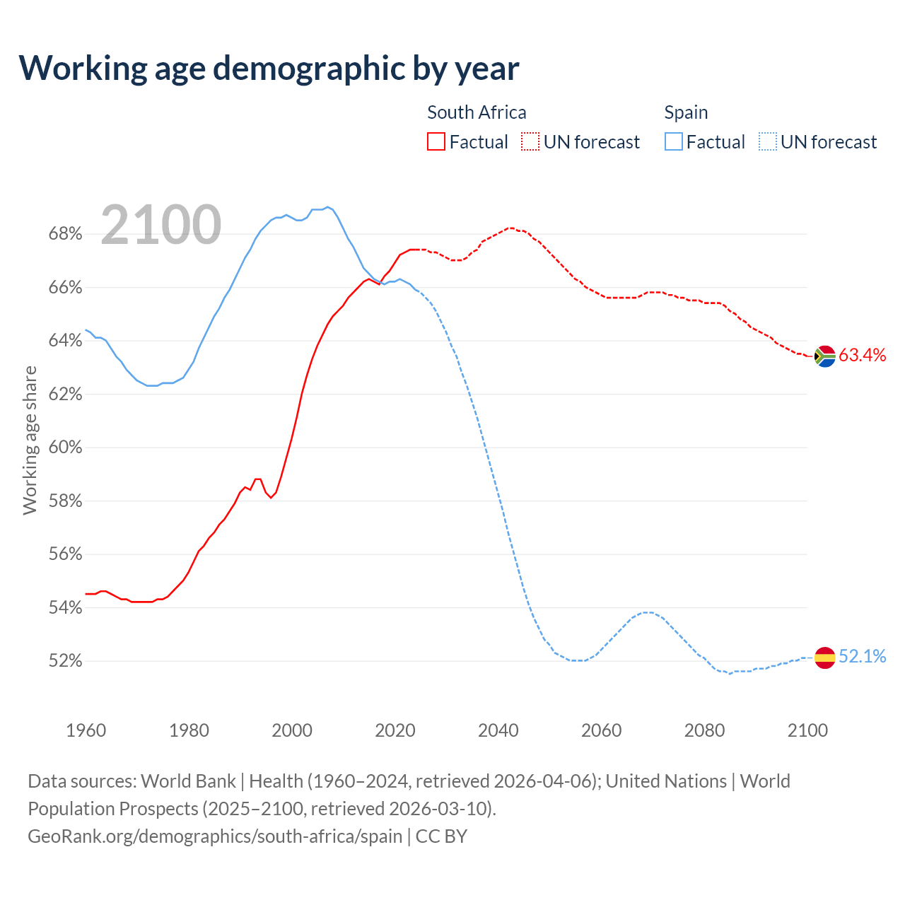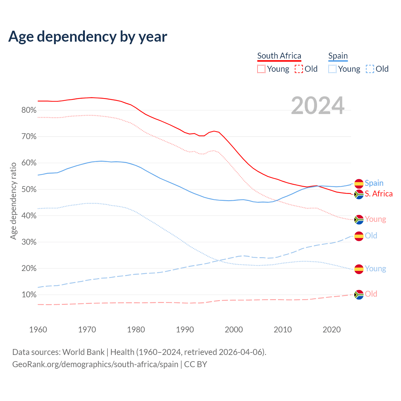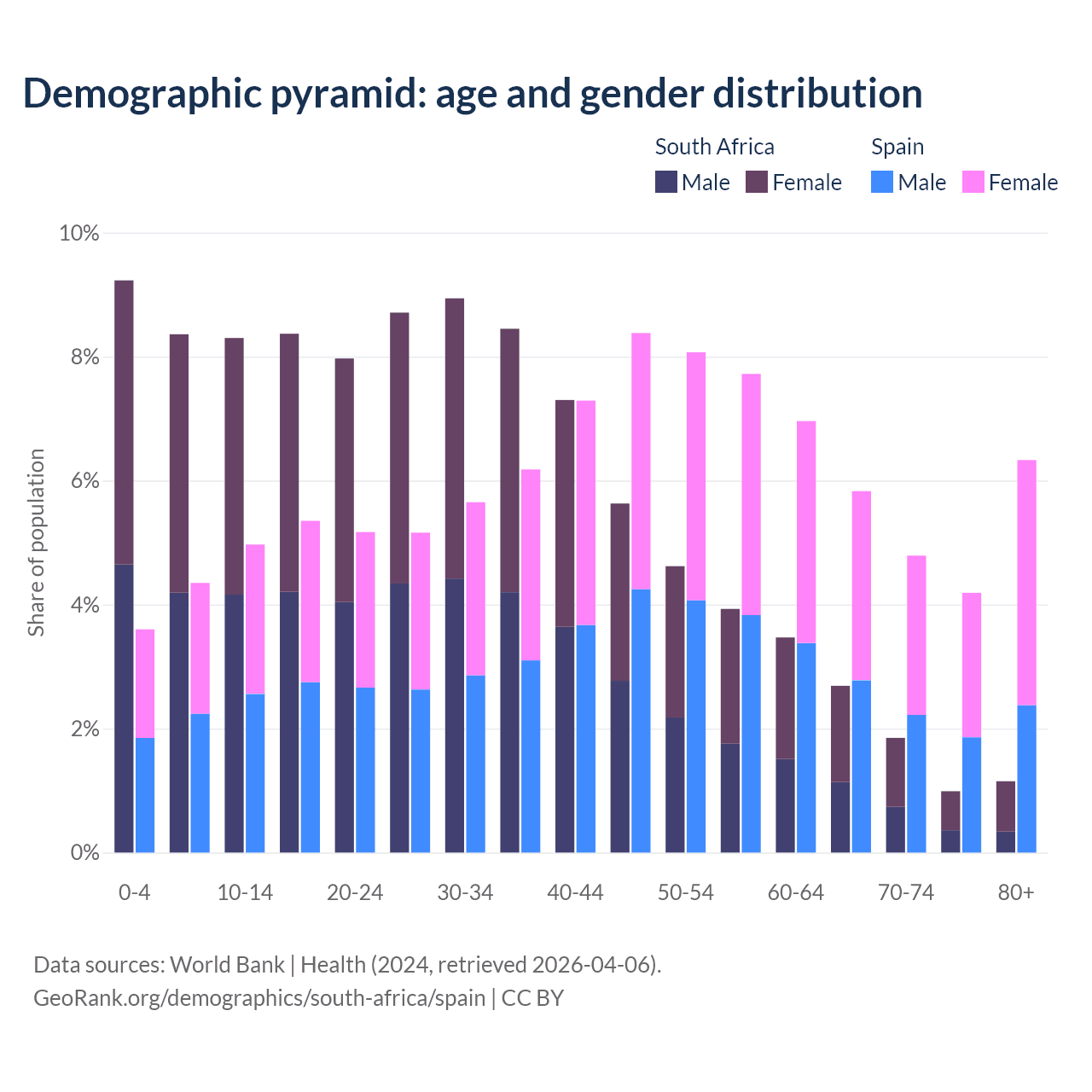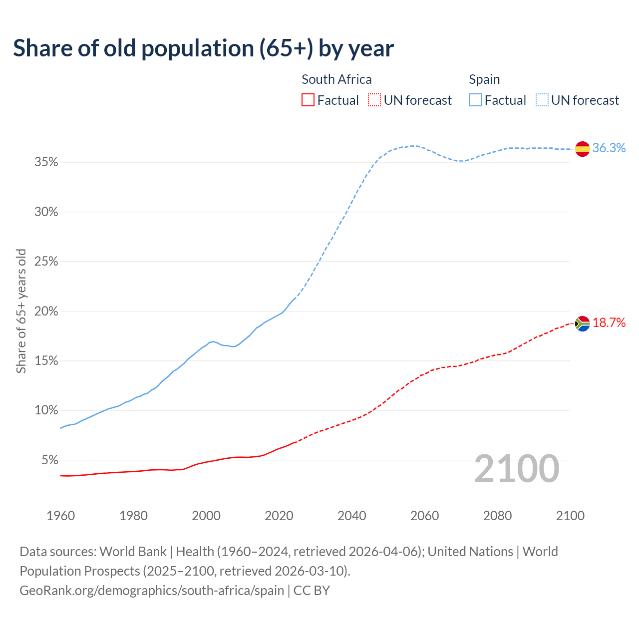 The share of older people aged 65 and over is 6.69% in South Africa and 21.1% in Spain. Life expectancy in South Africa compared to Spain .