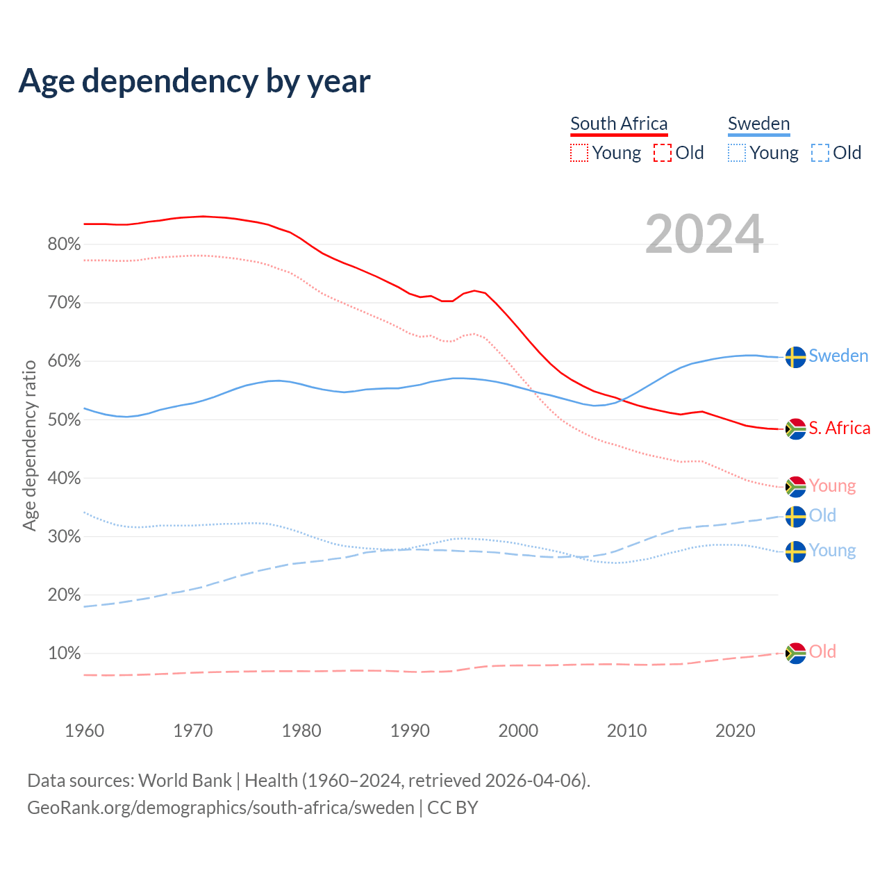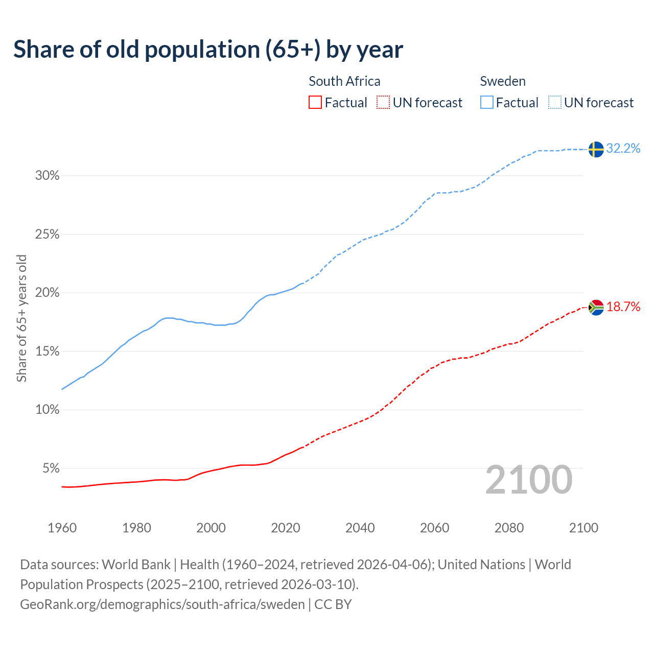 - The share of old-age demographic (65+) in South Africa is 6.69% vs 20.7% in Sweden.