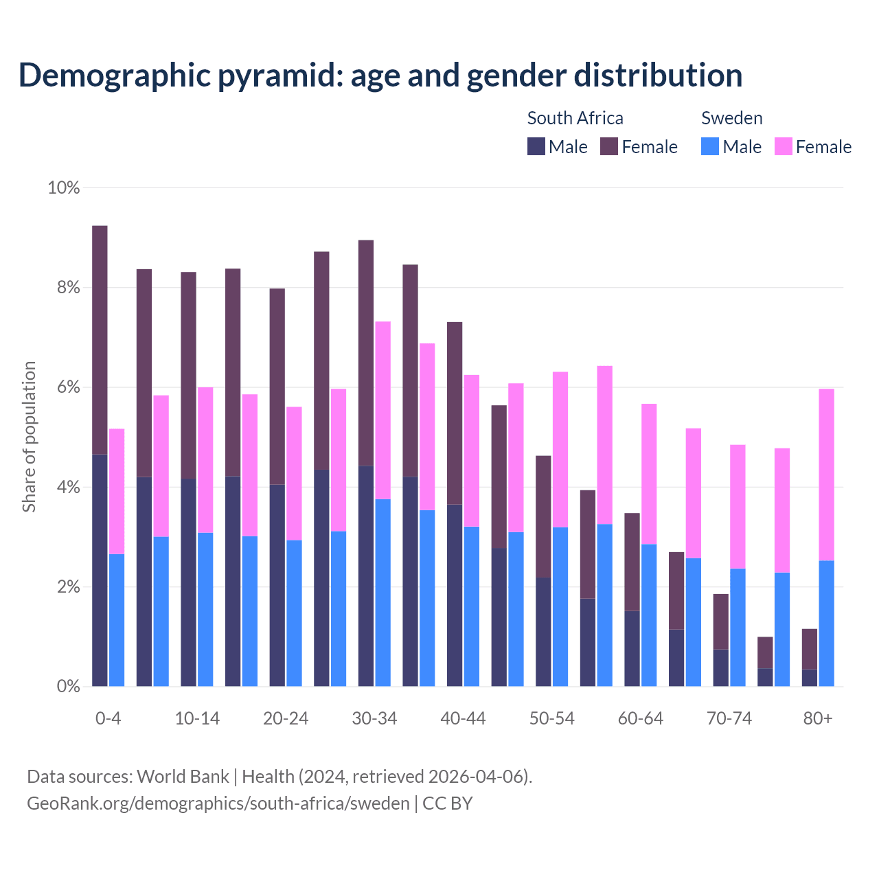 - South Africa is ranked 107/196 by median age (oldest to youngest) vs 39/196 for Sweden.