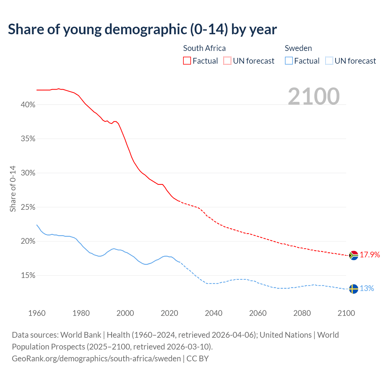 - The share of young demographic (0-15 years old) in South Africa is 25.9% vs 17% in Sweden.