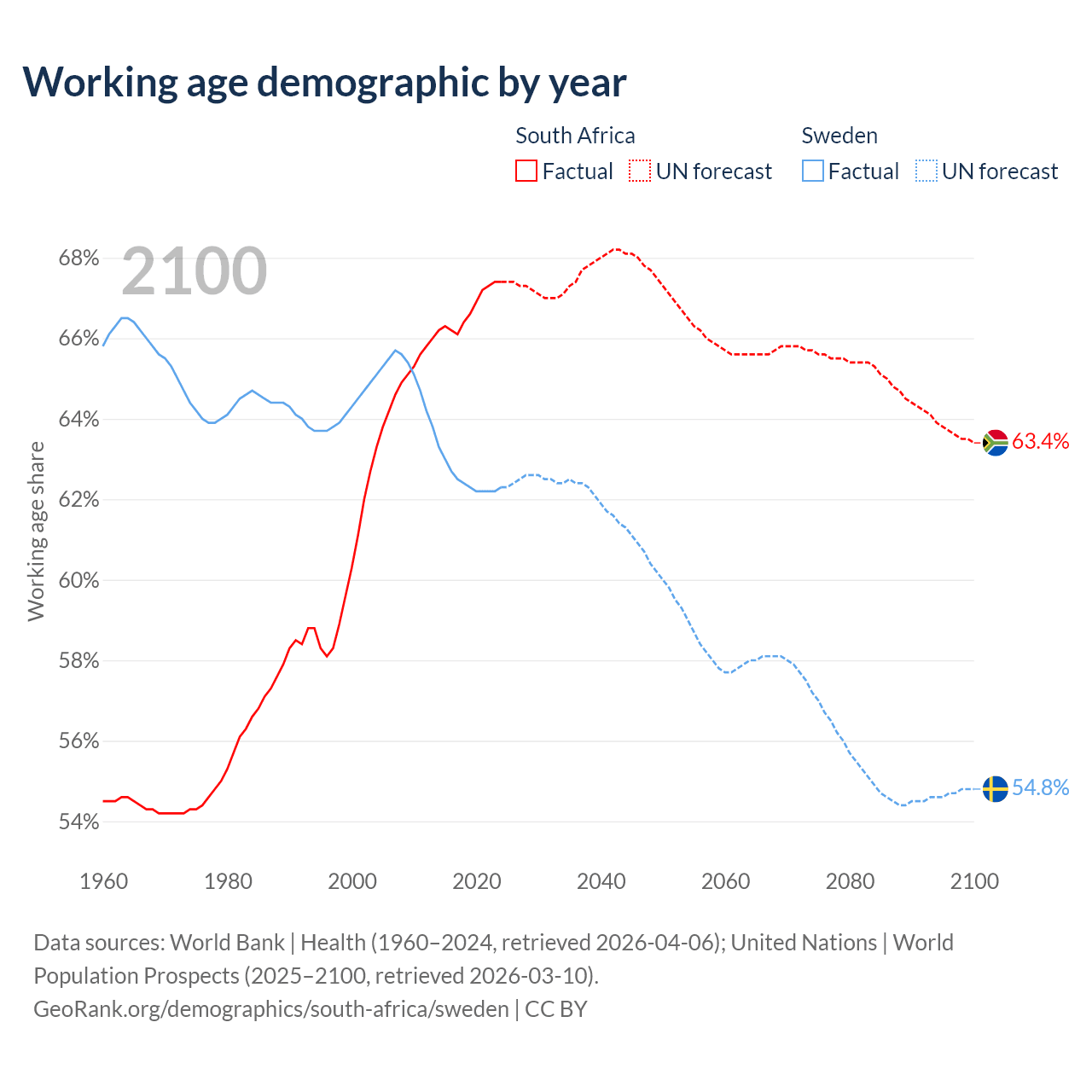 - South Africa has 44.3M working age adults (aged 15-64) vs 6.65M in Sweden.