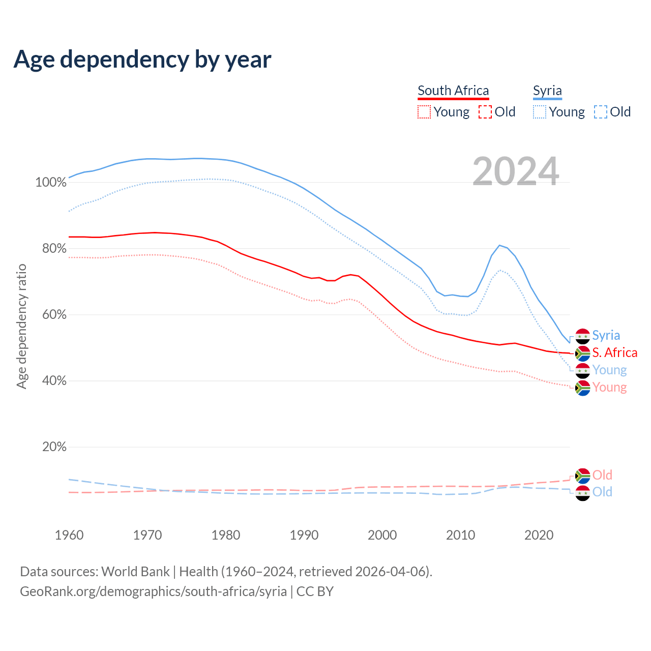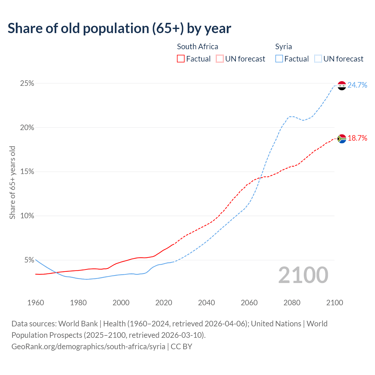 - The share of old-age demographic (65+) in South Africa is 6.69% vs 4.74% in Syria.