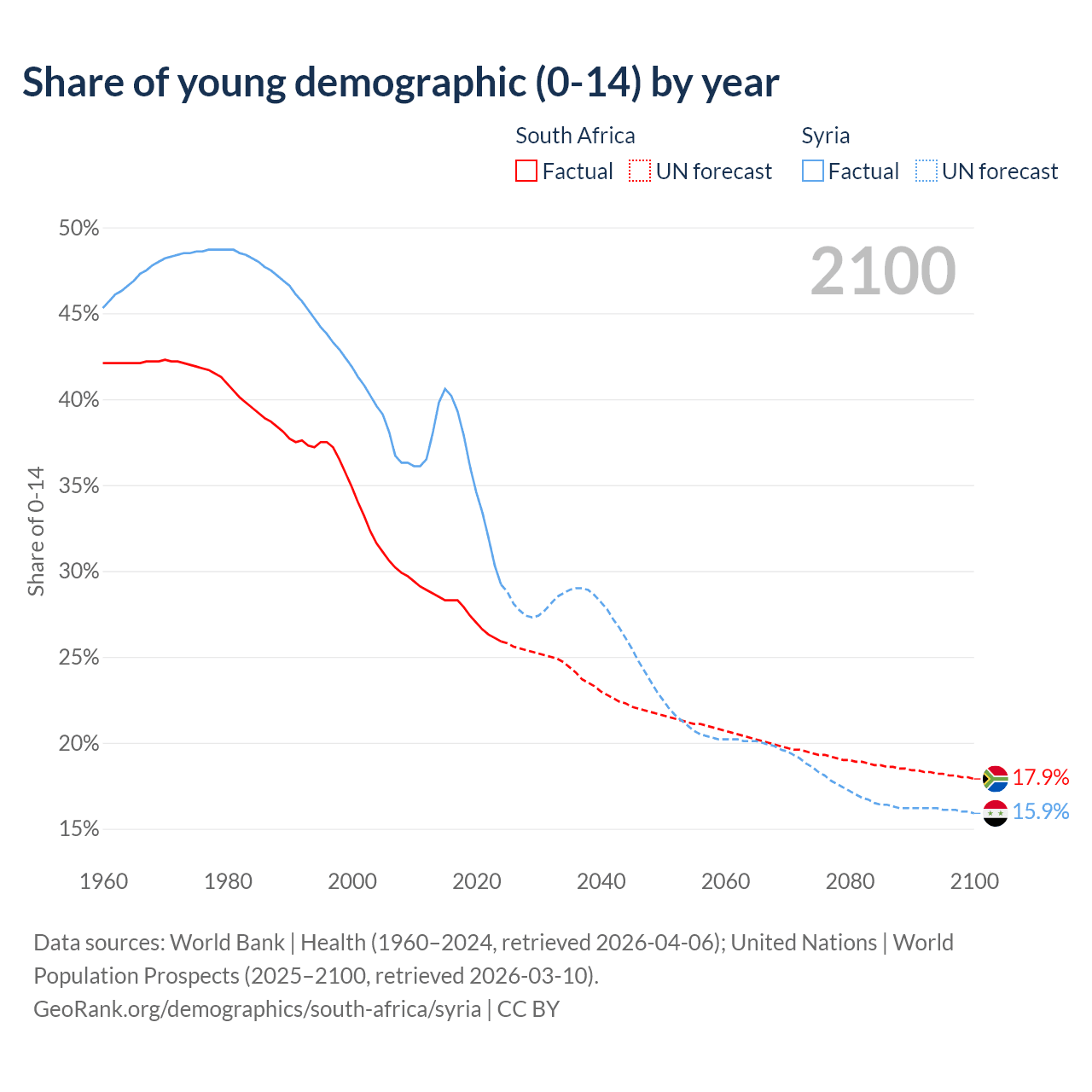- The share of young demographic (0-15 years old) in South Africa is 25.9% vs 29.2% in Syria.