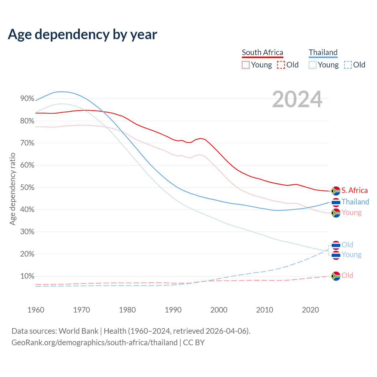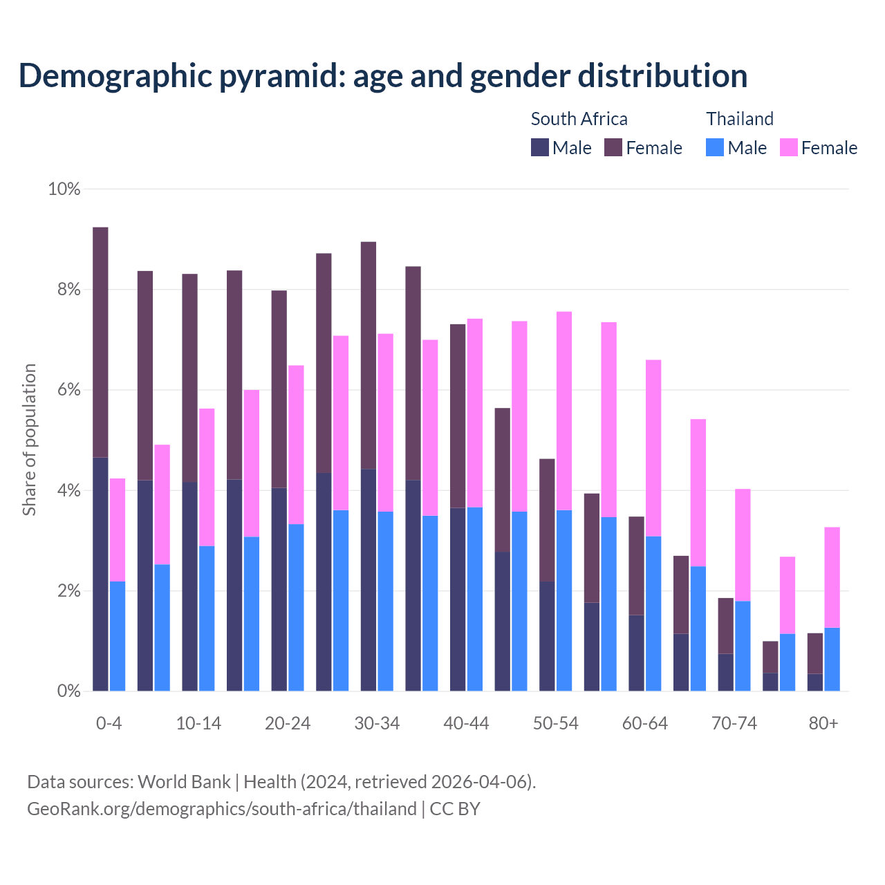 - South Africa is ranked 107/196 by median age (oldest to youngest) vs 40/196 for Thailand.