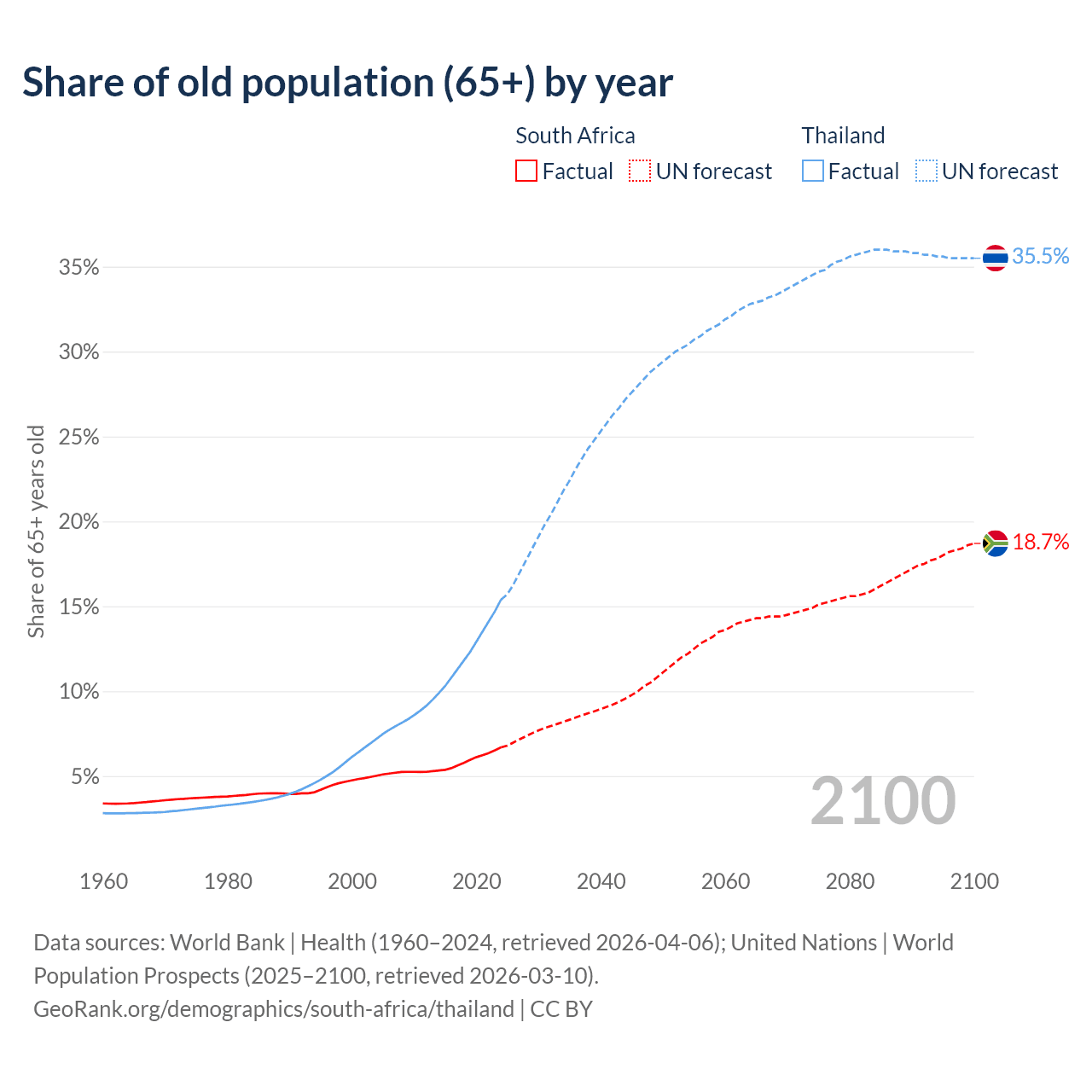 The share of older people aged 65 and over is 6.69% in South Africa and 15.4% in Thailand. Life expectancy in South Africa compared to Thailand .