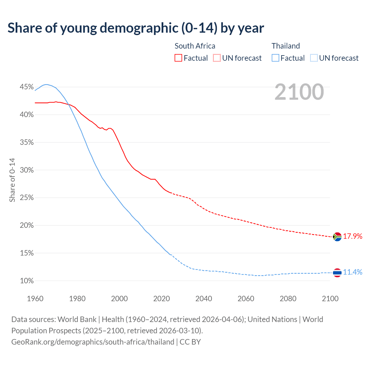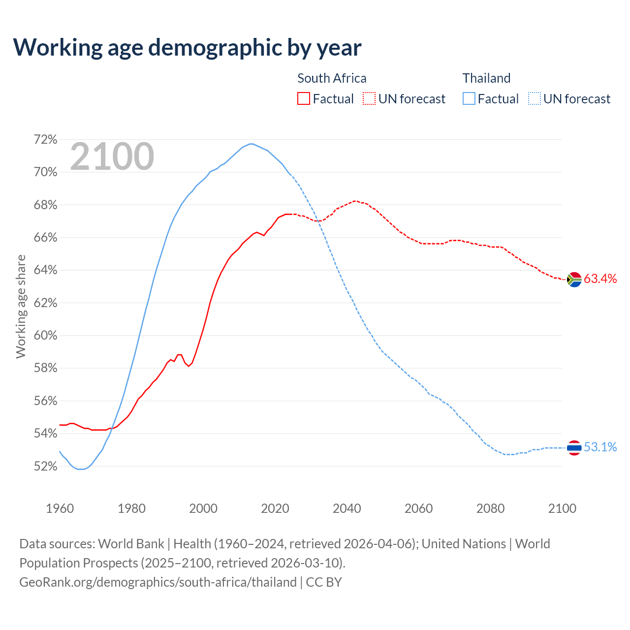 - As of 2026, the population of South Africa is 65.7M vs 71.6M in Thailand.
