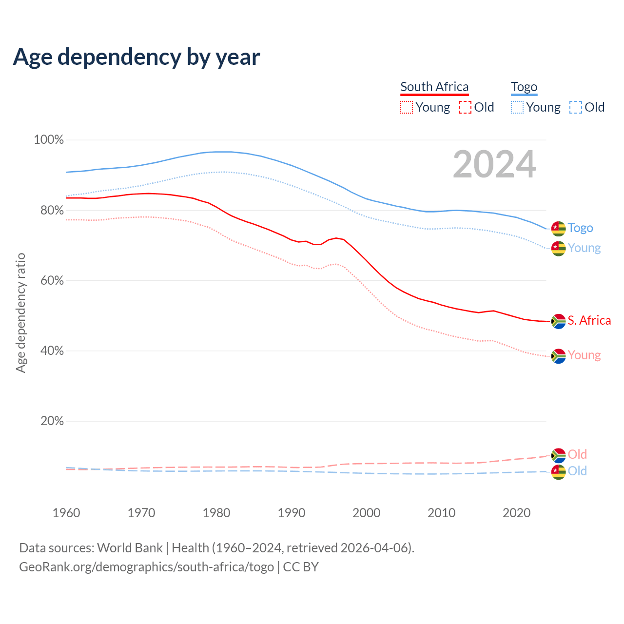 The share of older people aged 65 and over is 6.69% in South Africa and 3.21% in Togo. Life expectancy in South Africa compared to Togo .