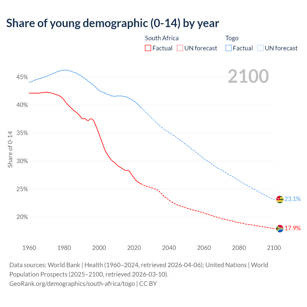 Median age South Africa vs Togo, 1960-2100