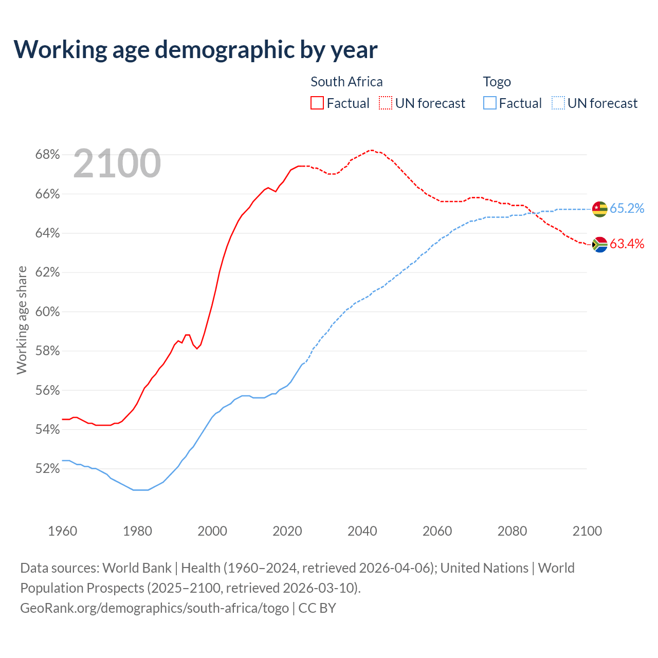 - South Africa has 44.3M working age adults (aged 15-64) vs 5.72M in Togo.