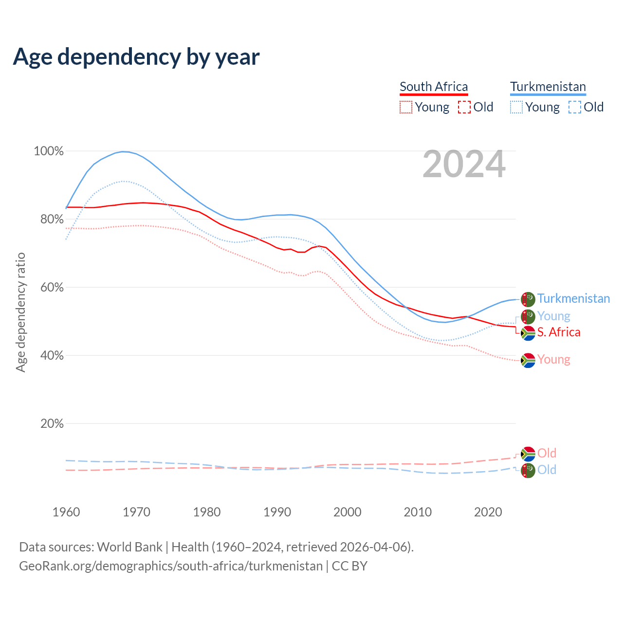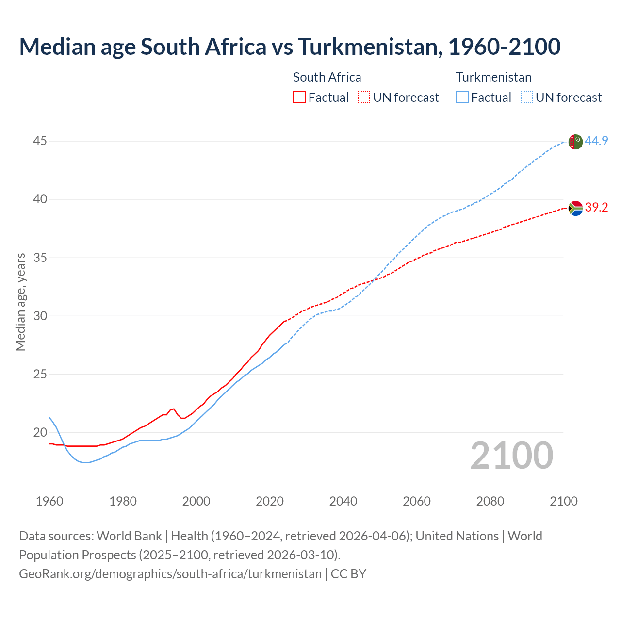 - South Africa is ranked 107/196 by median age (oldest to youngest) vs 119/196 for Turkmenistan.