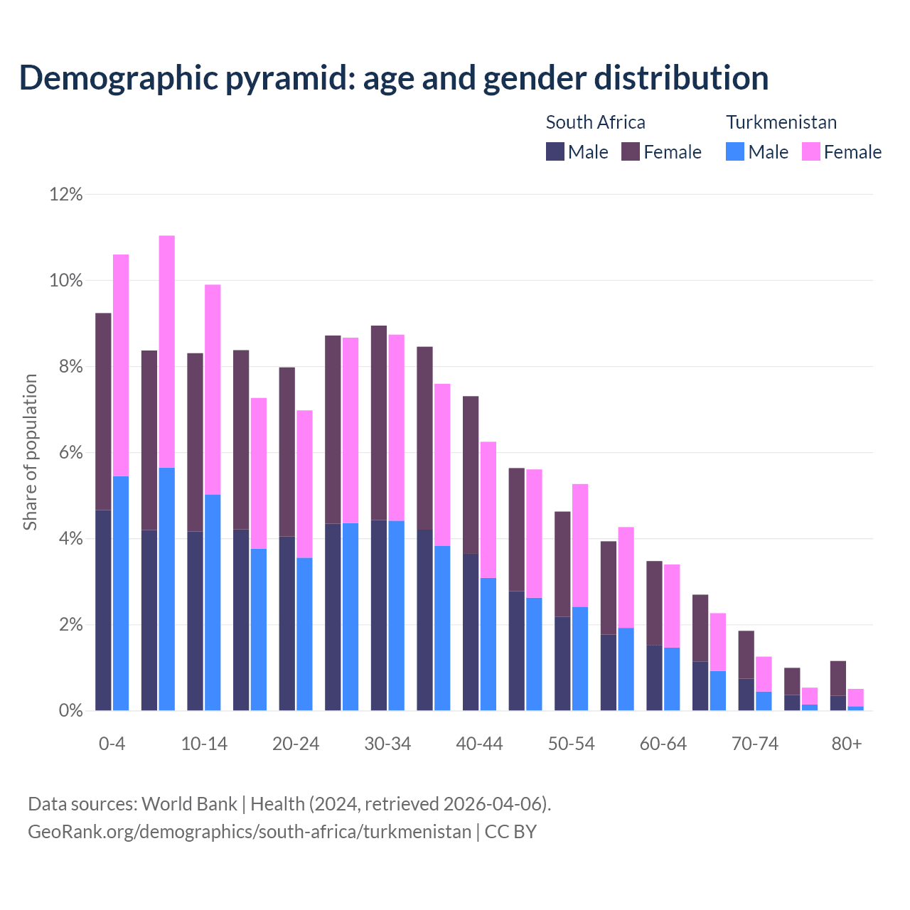 - As of 2026, the population of South Africa is 65.7M vs 7.78M in Turkmenistan - 8.45 times difference.