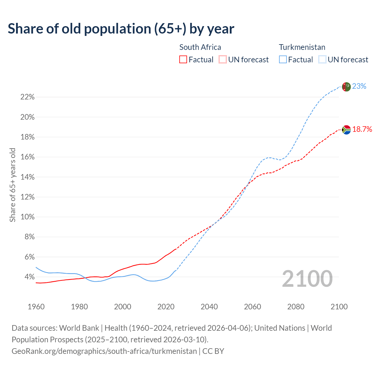 - The share of old-age demographic (65+) in South Africa is 6.69% vs 4.53% in Turkmenistan.