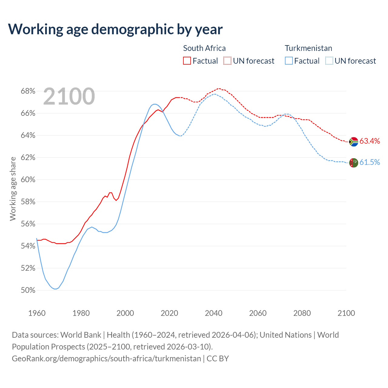 - South Africa has 44.3M working age adults (aged 15-64) vs 4.97M in Turkmenistan.