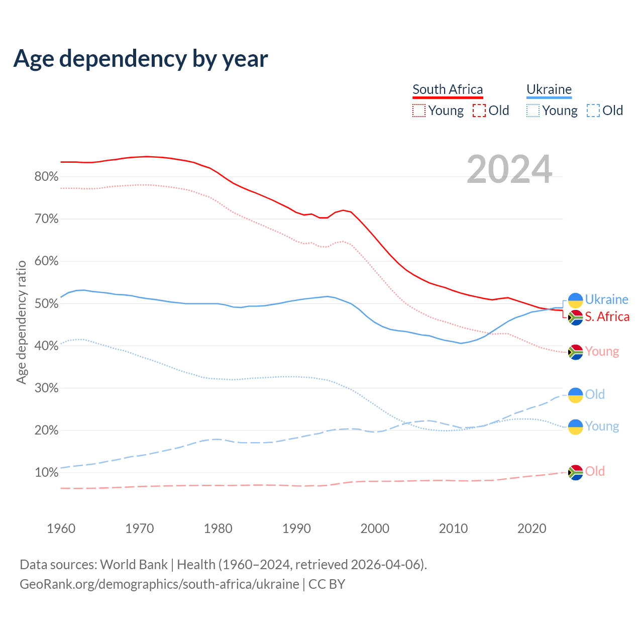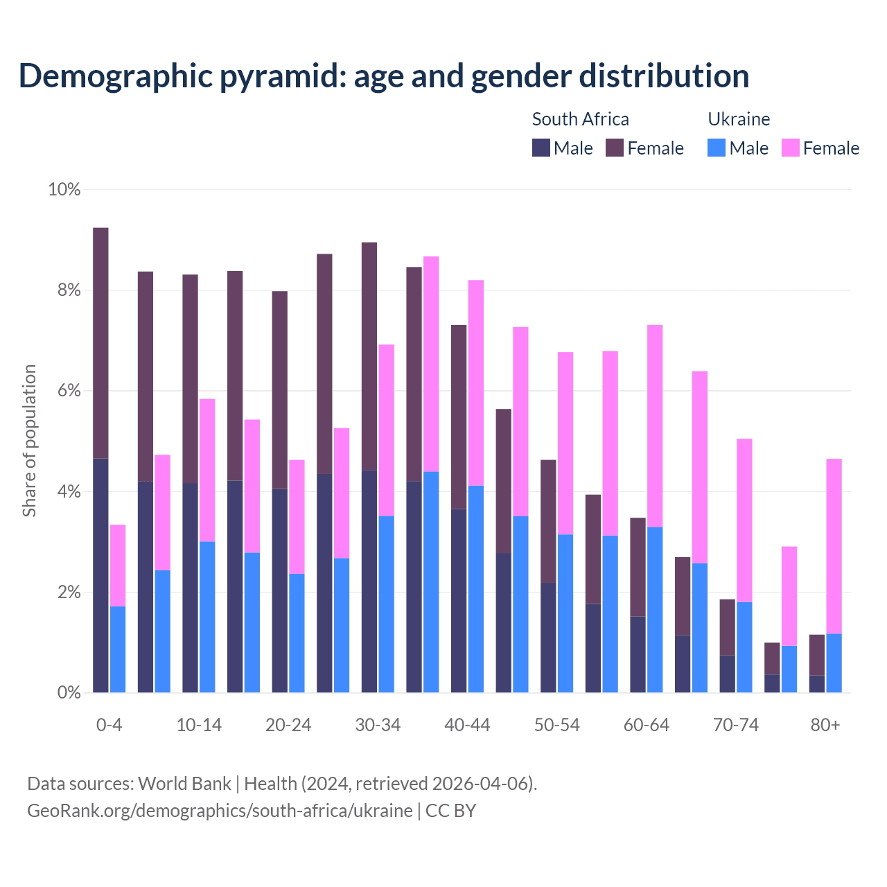 - South Africa is ranked 107/196 by median age (oldest to youngest) vs 26/196 for Ukraine.