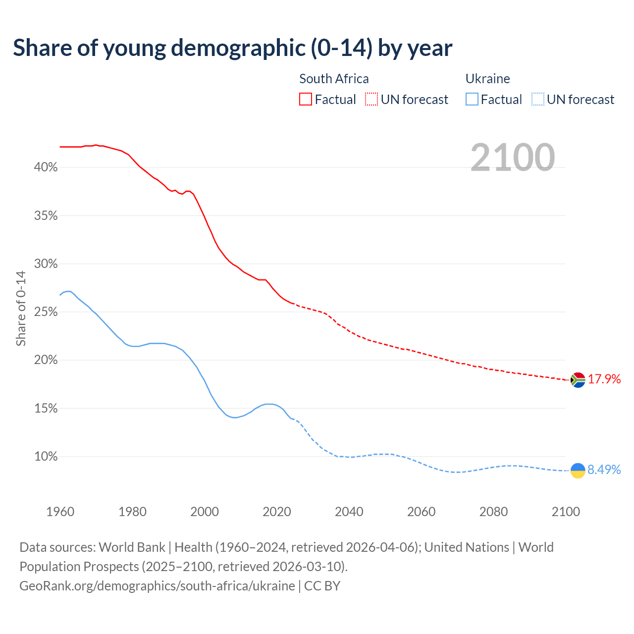 - The share of young demographic (0-15 years old) in South Africa is 25.9% vs 13.9% in Ukraine.