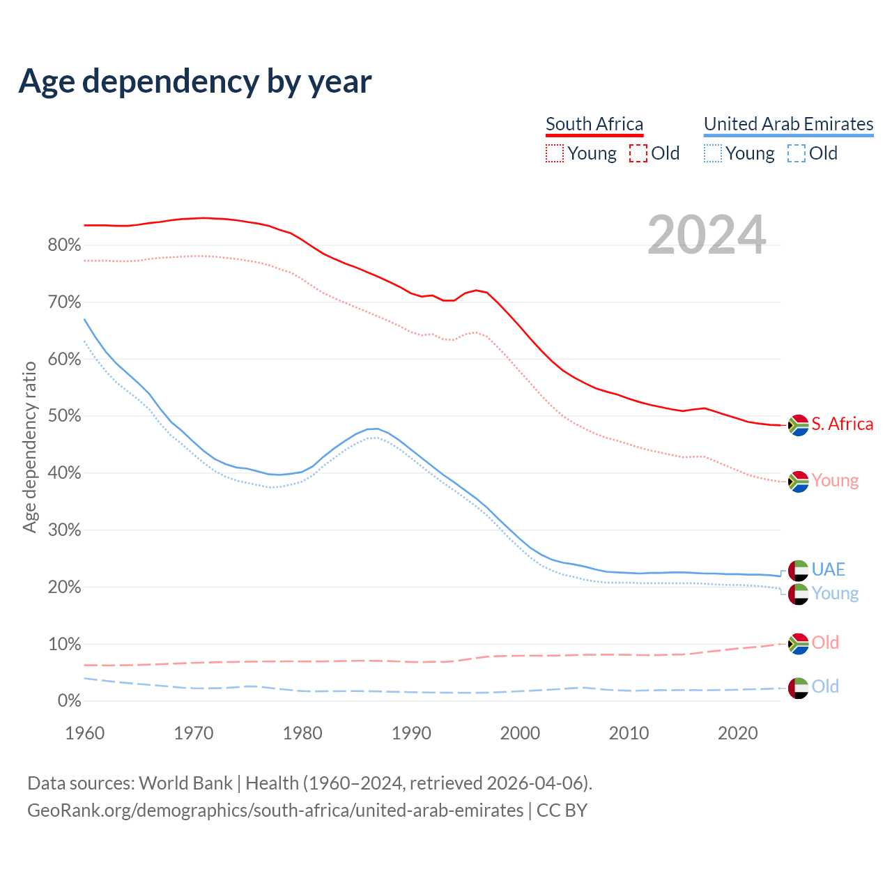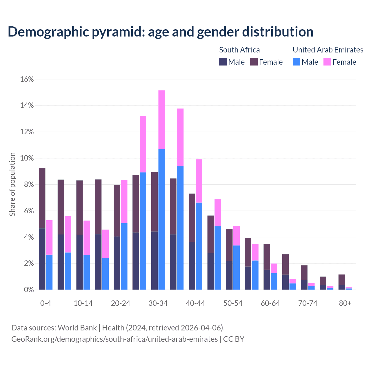 - South Africa is ranked 107/196 by median age (oldest to youngest) vs 91/196 for the United Arab Emirates.