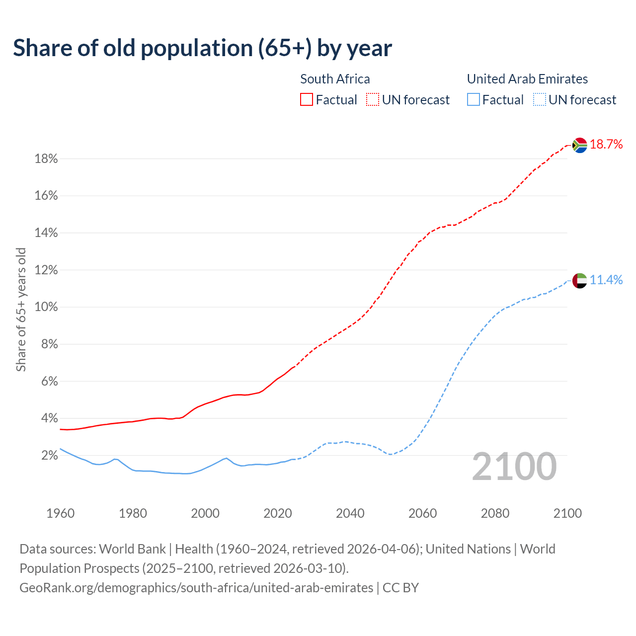 - The share of old-age demographic (65+) in South Africa is 6.69% vs 1.77% in the United Arab Emirates.