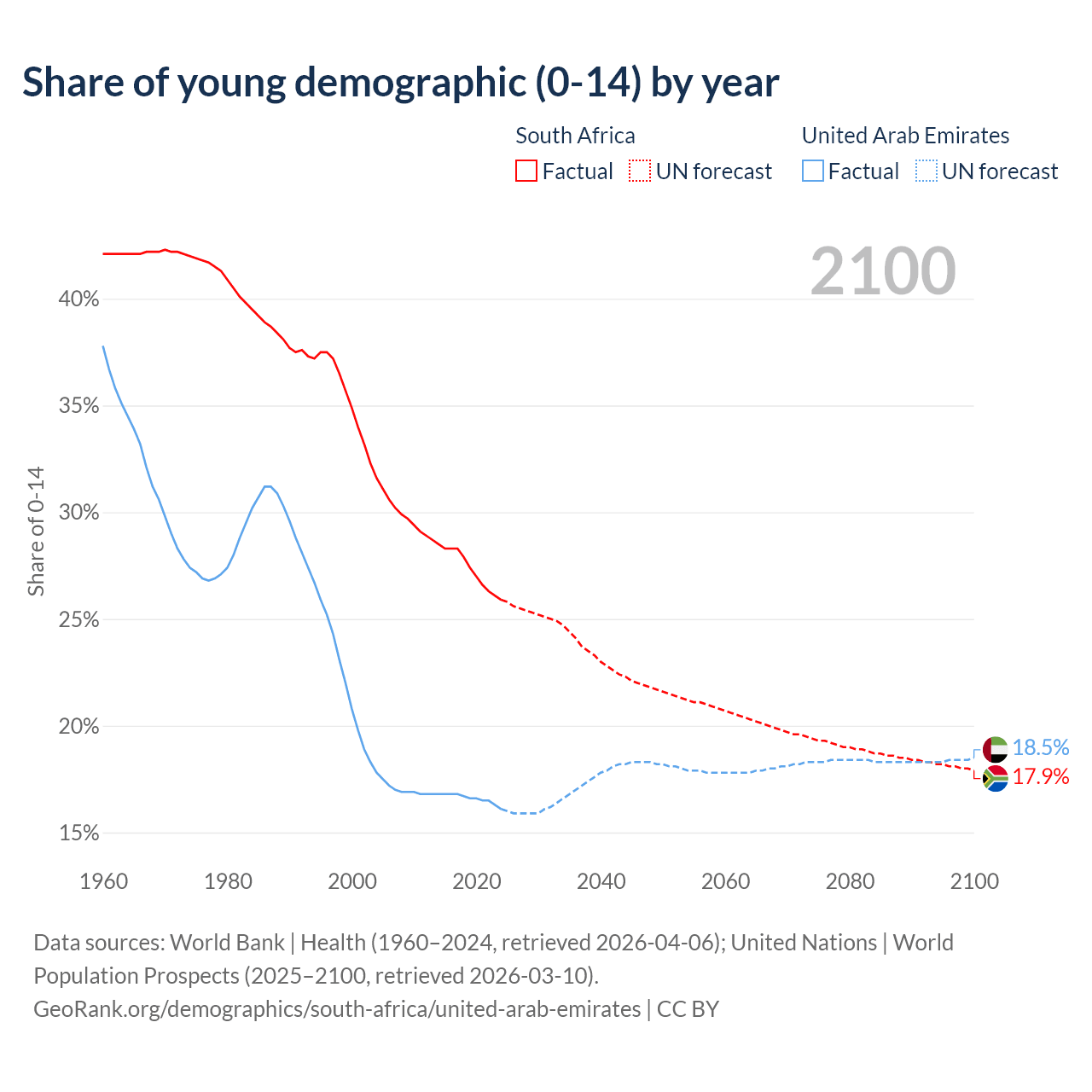- The share of young demographic (0-15 years old) in South Africa is 25.9% vs 16.1% in the United Arab Emirates.