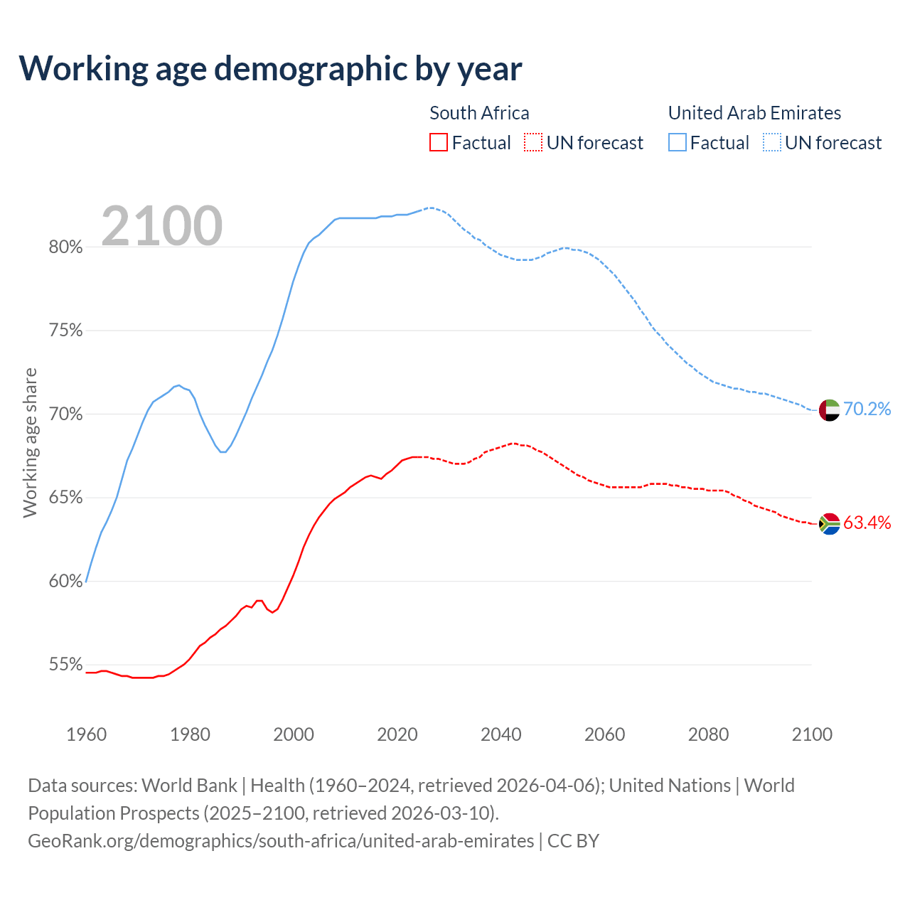 - As of 2026, the population of South Africa is 65.7M vs 11.7M in the United Arab Emirates - 5.62 times difference.