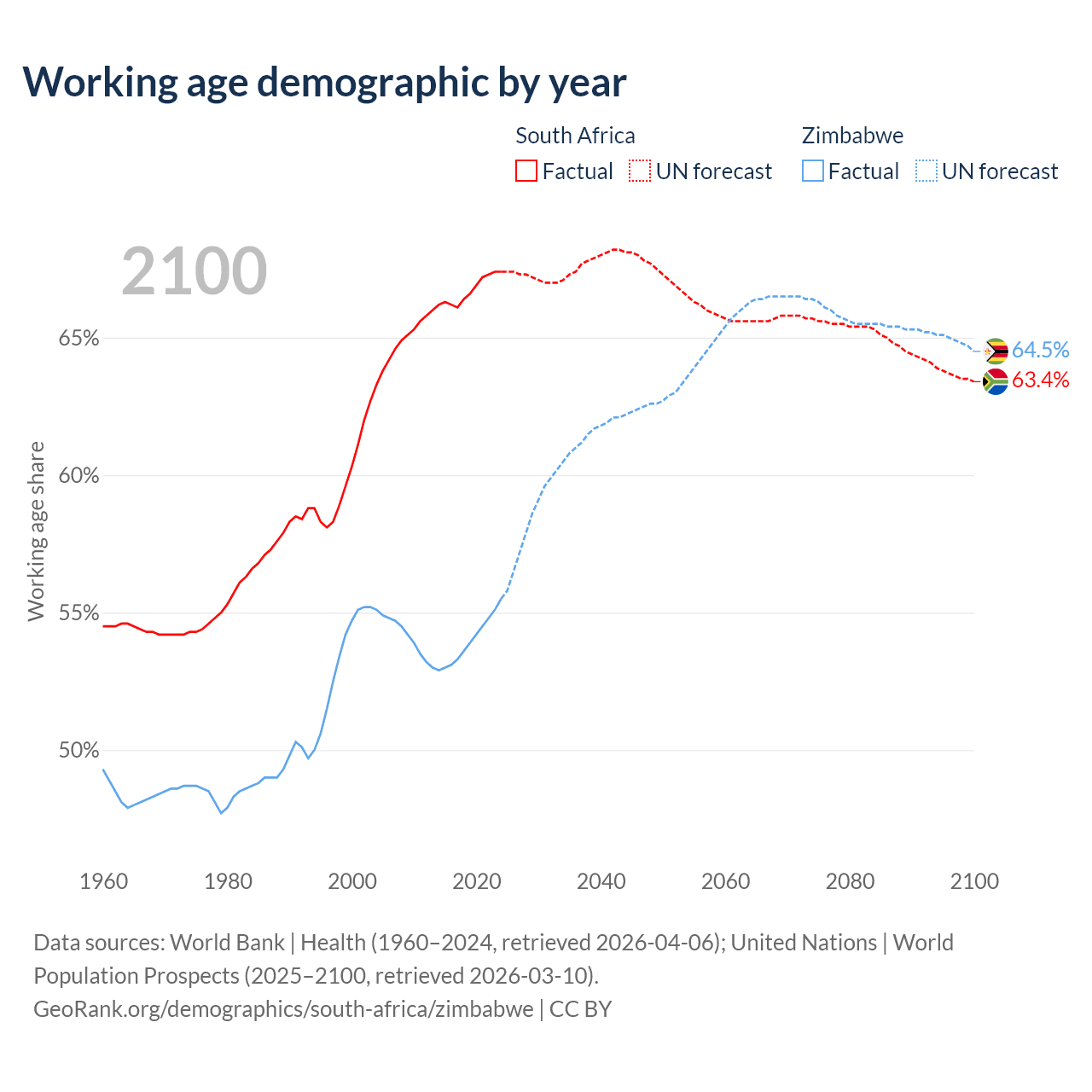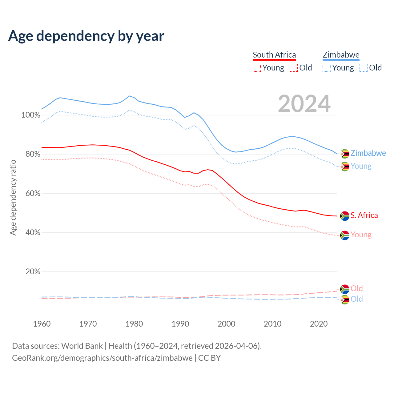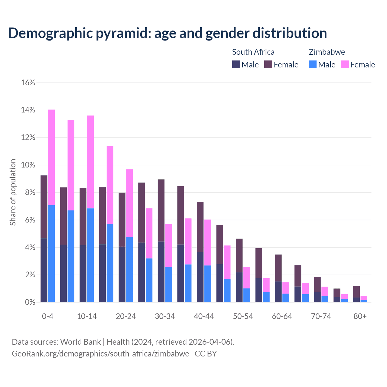 The share of older people aged 65 and over is 6.69% in South Africa and 3.6% in Zimbabwe. Life expectancy in South Africa compared to Zimbabwe .