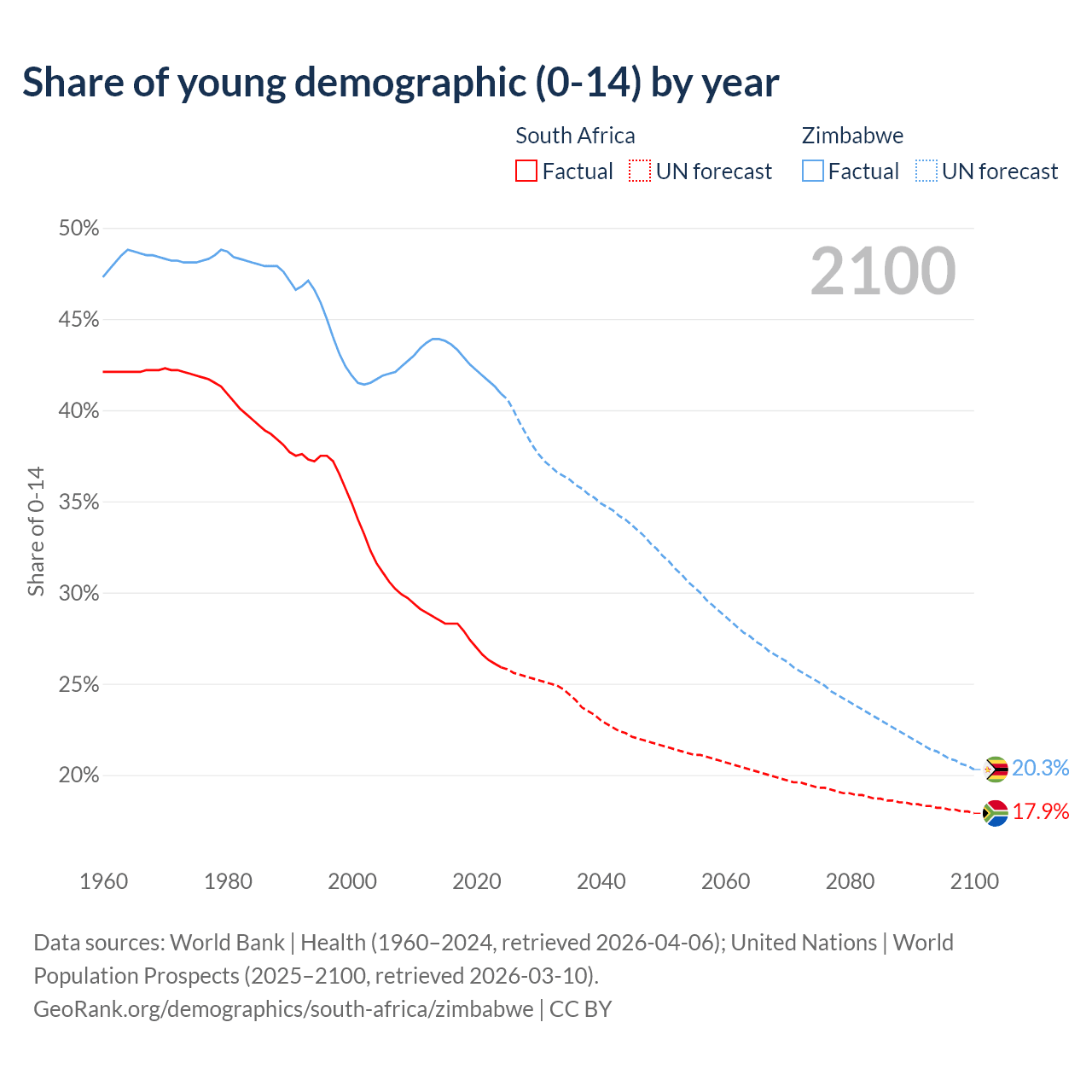 Median age South Africa vs Zimbabwe, 1960-2100