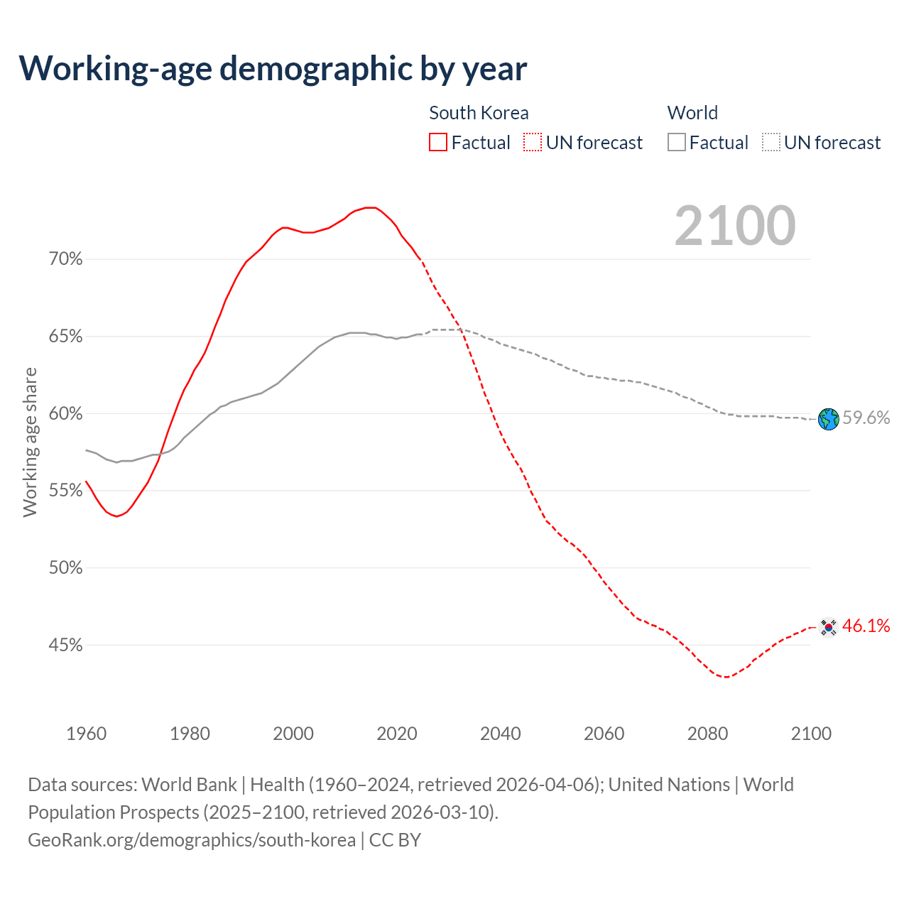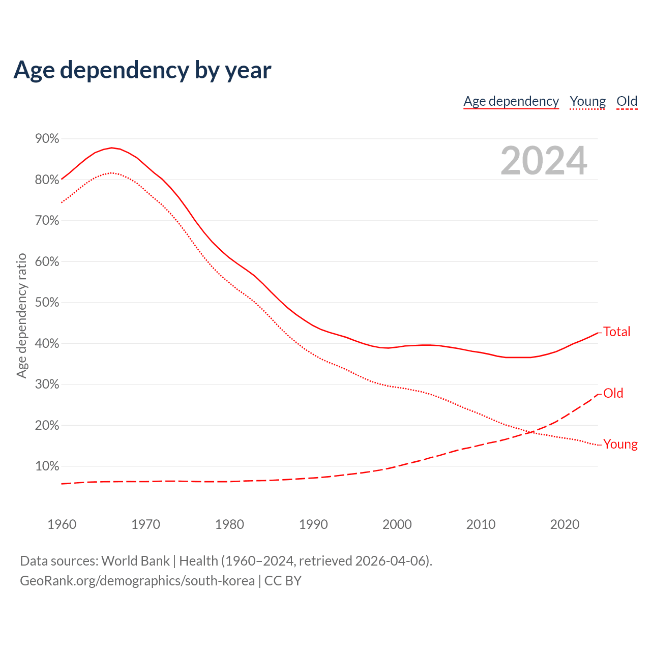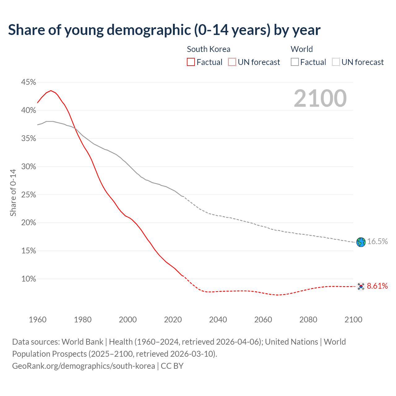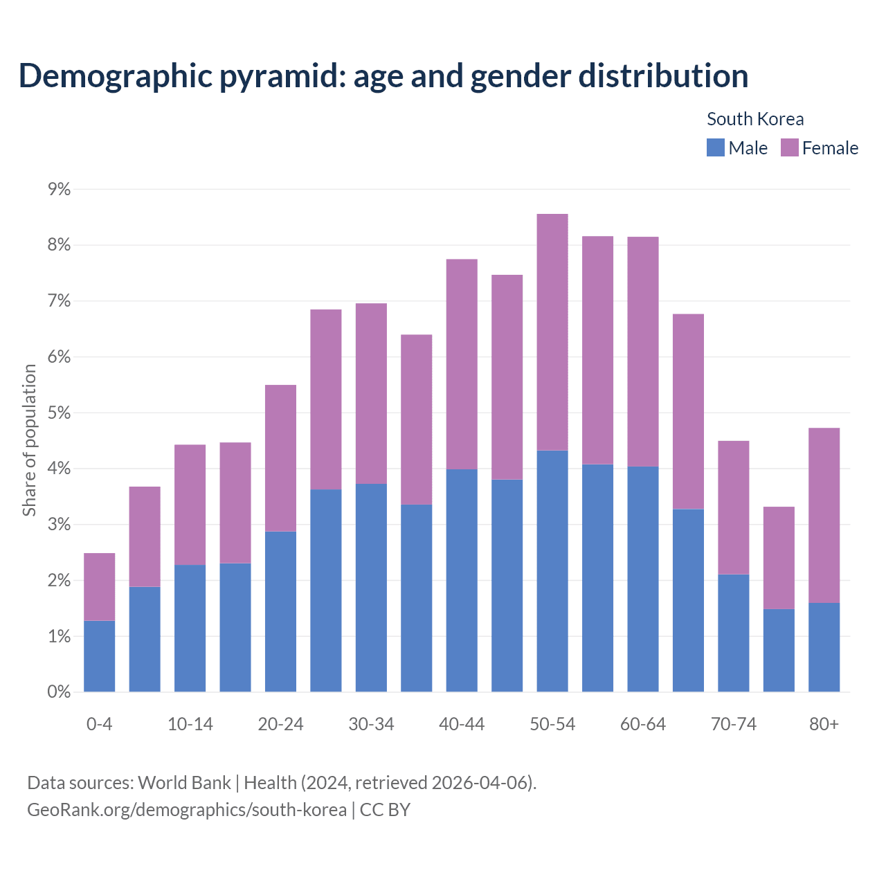 With a population of 51.8M people, South Korea has a median age of 46.1 years which makes it the 10/196 oldest country. 10.6% of the demographic are children 0-14 years old, 70.2% are working-age people aged 15-64, and 19.3% are older population aged 65+ years.
