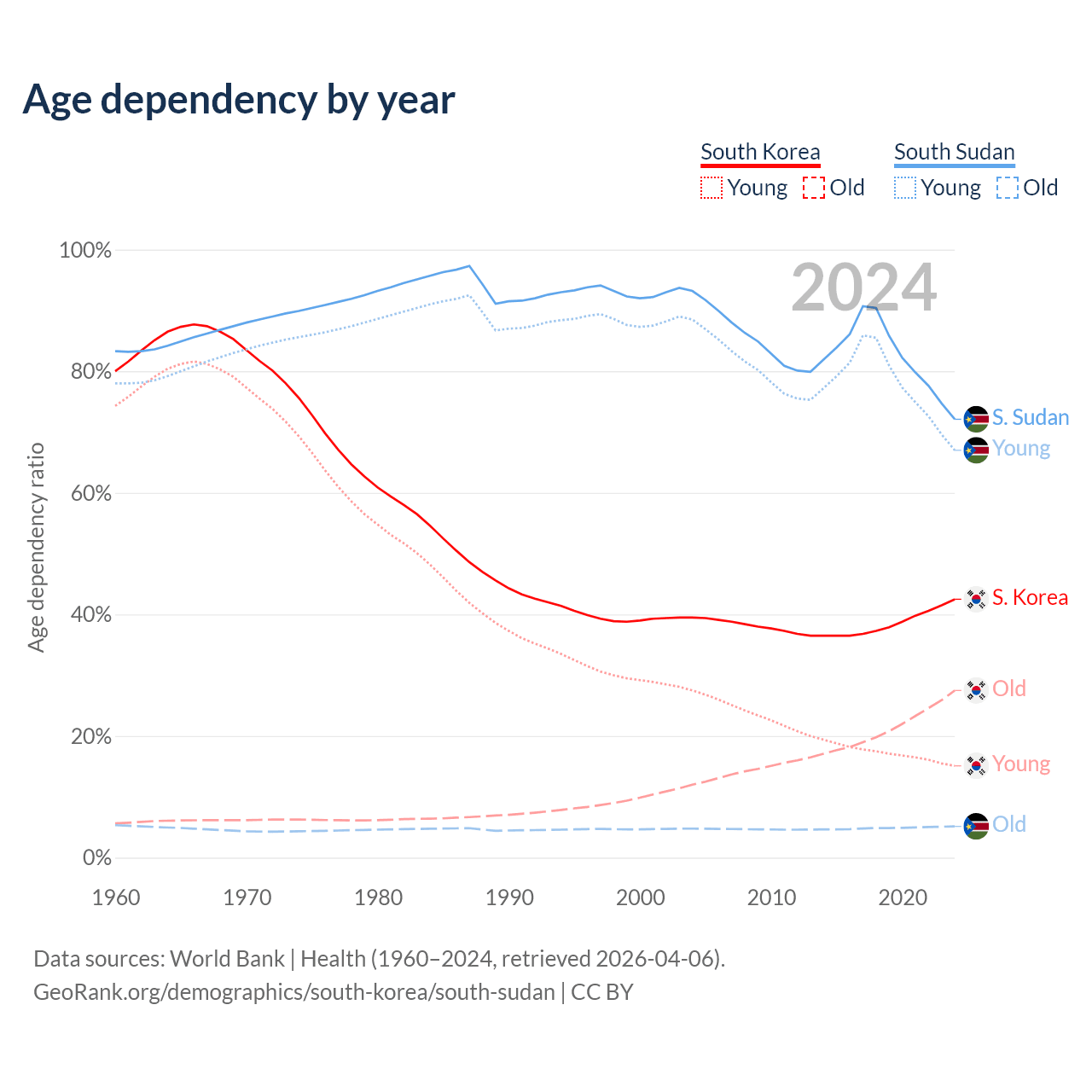 - South Korea is ranked 10/196 by median age (oldest to youngest) vs 173/196 for South Sudan.