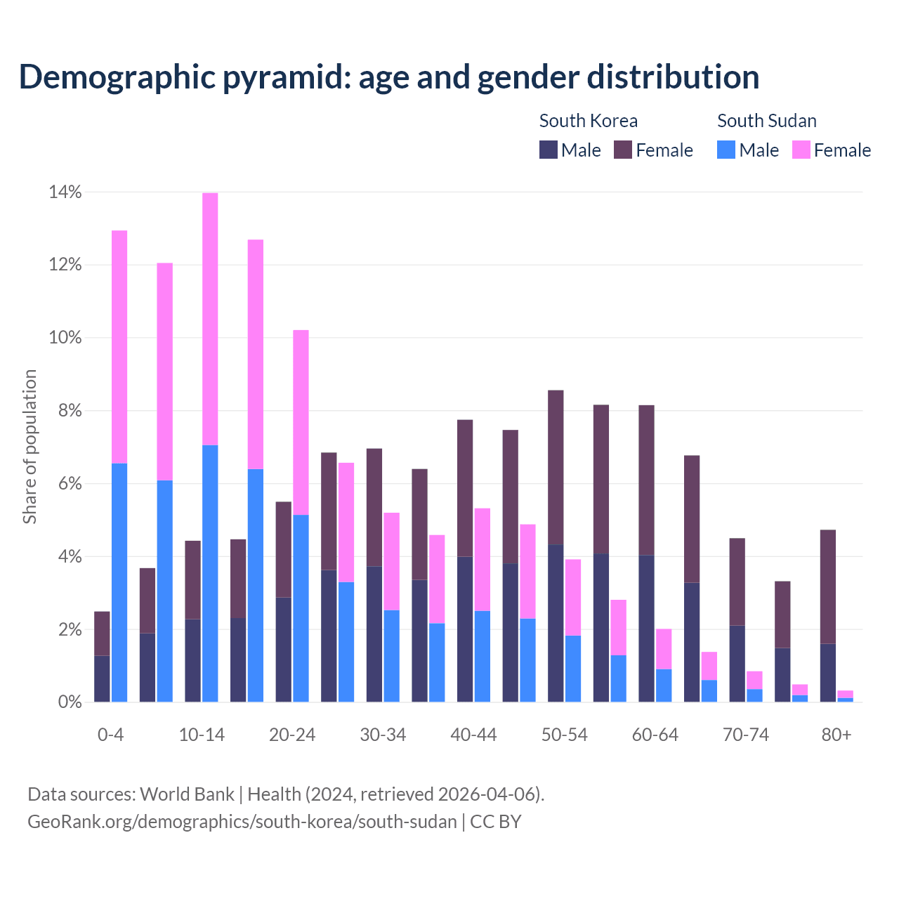 - As of 2026, the population of South Korea is 51.6M vs 12.5M in South Sudan - 4.13 times difference.