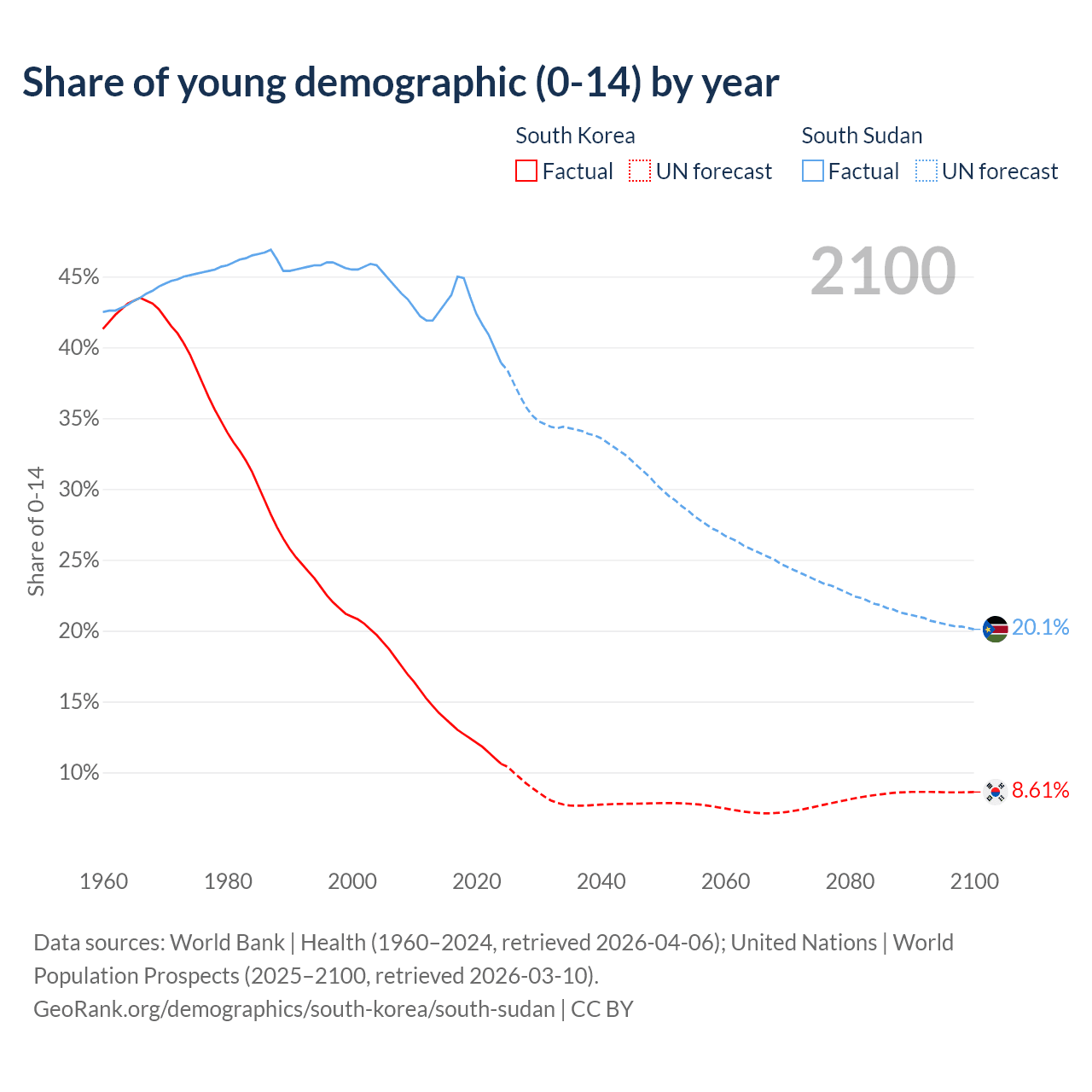 - The share of young demographic (0-15 years old) in South Korea is 10.6% vs 38.9% in South Sudan.