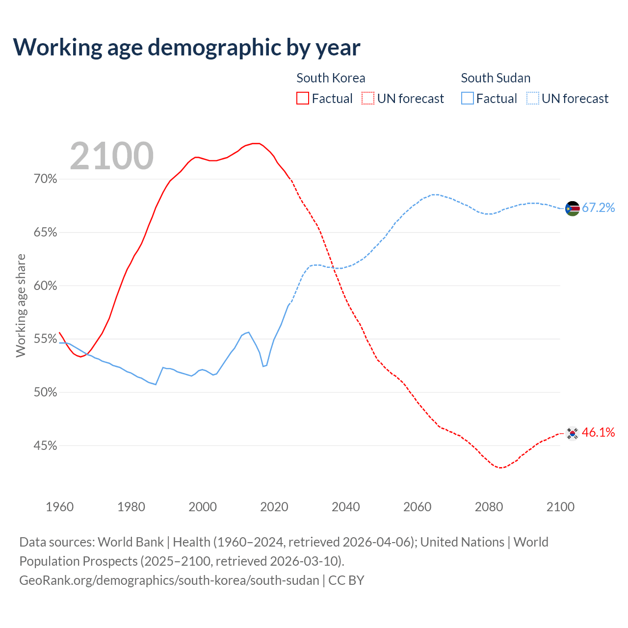- South Korea has 36.2M working age adults (aged 15-64) vs 7.27M in South Sudan.