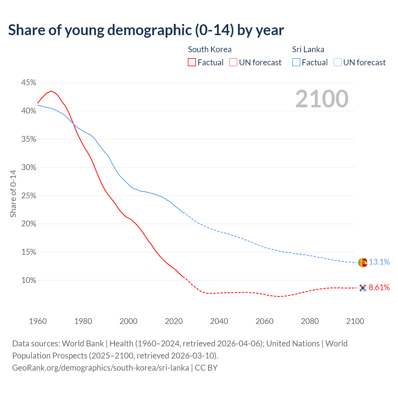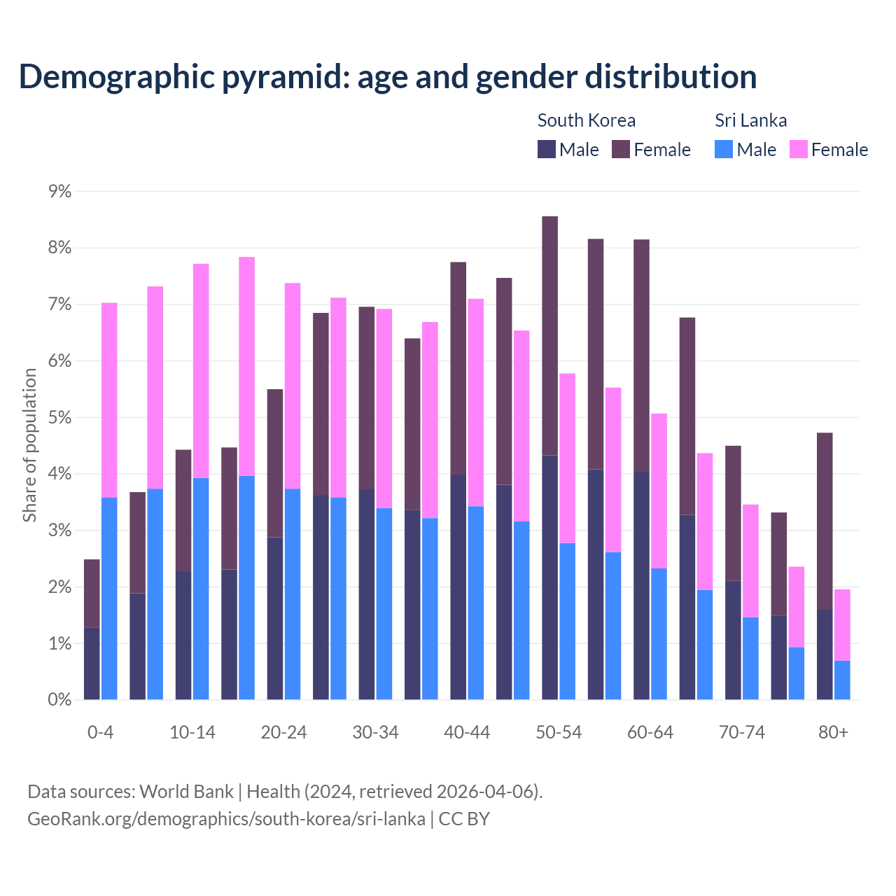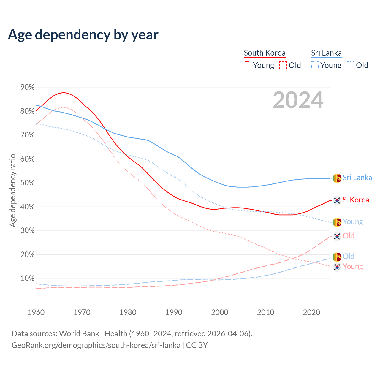 - South Korea is ranked 10/196 by median age (oldest to youngest) vs 81/196 for Sri Lanka.