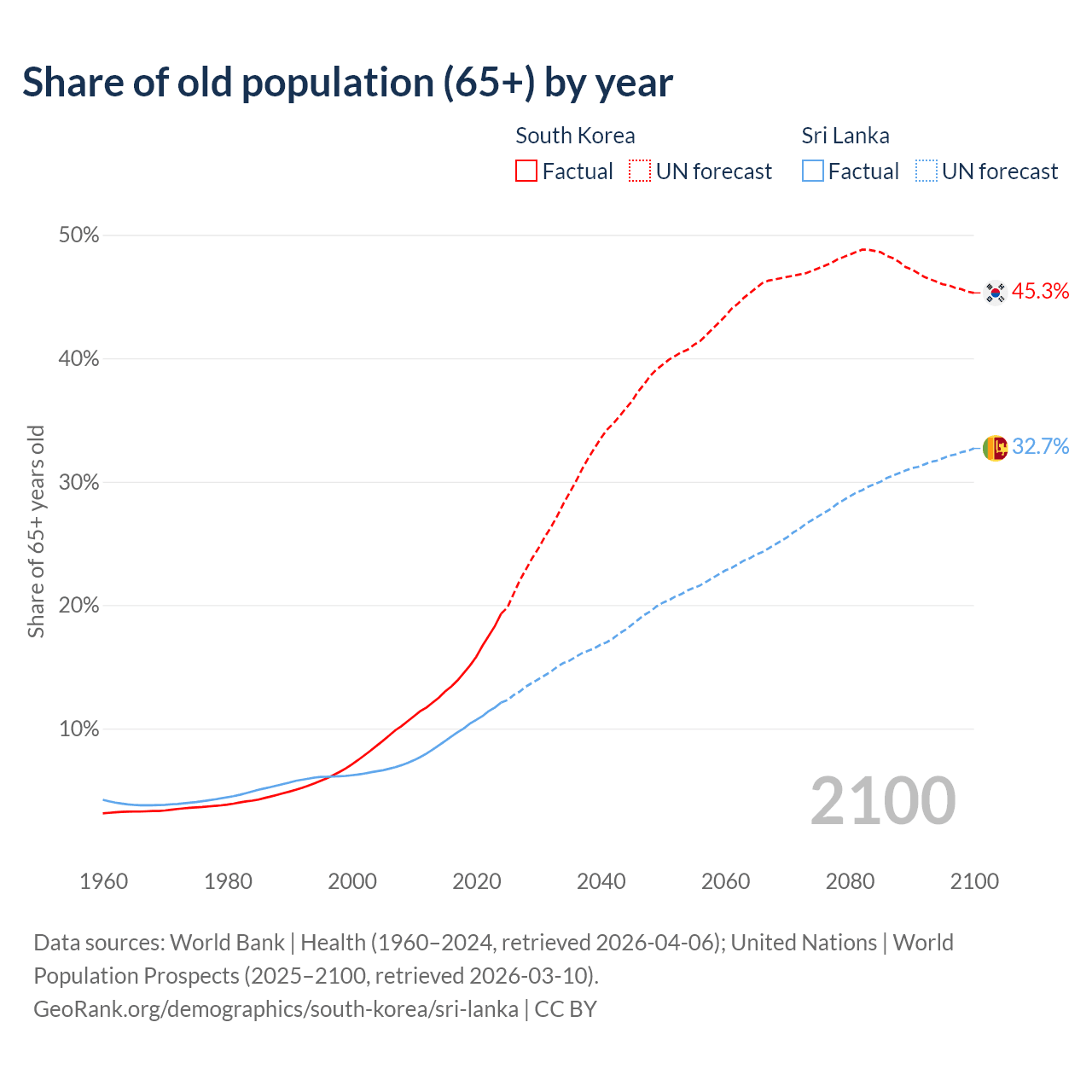 The share of older people aged 65 and over is 19.3% in South Korea and 12.1% in Sri Lanka. Life expectancy in South Korea compared to Sri Lanka .