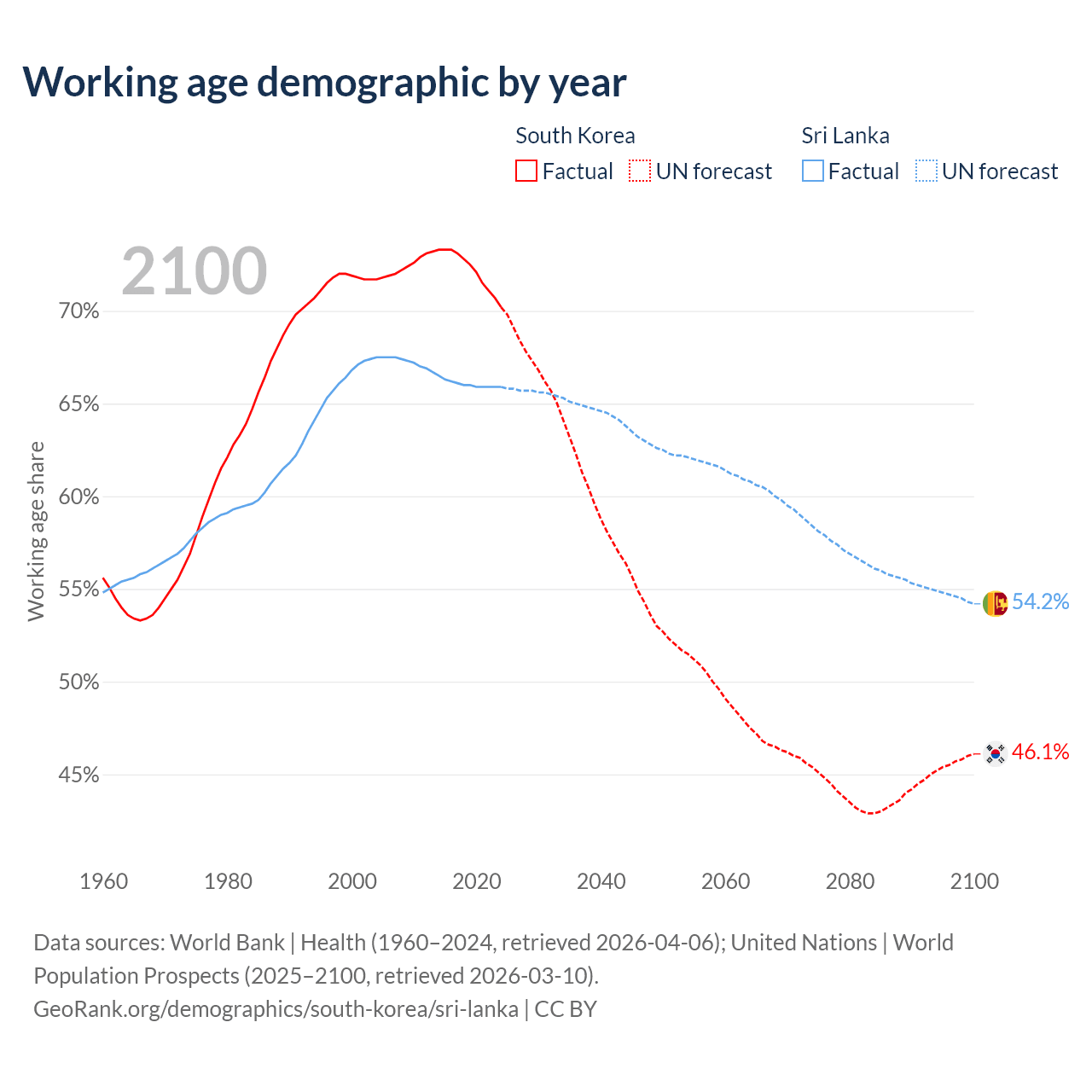 - South Korea has 36.2M working age adults (aged 15-64) vs 14.6M in Sri Lanka.