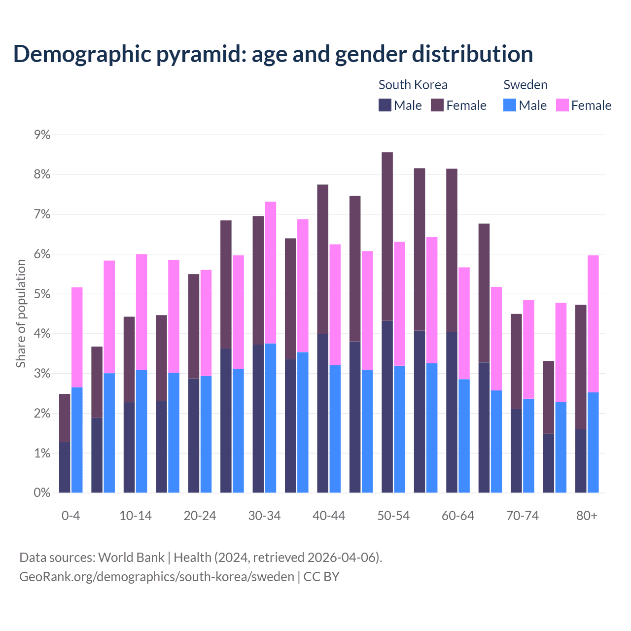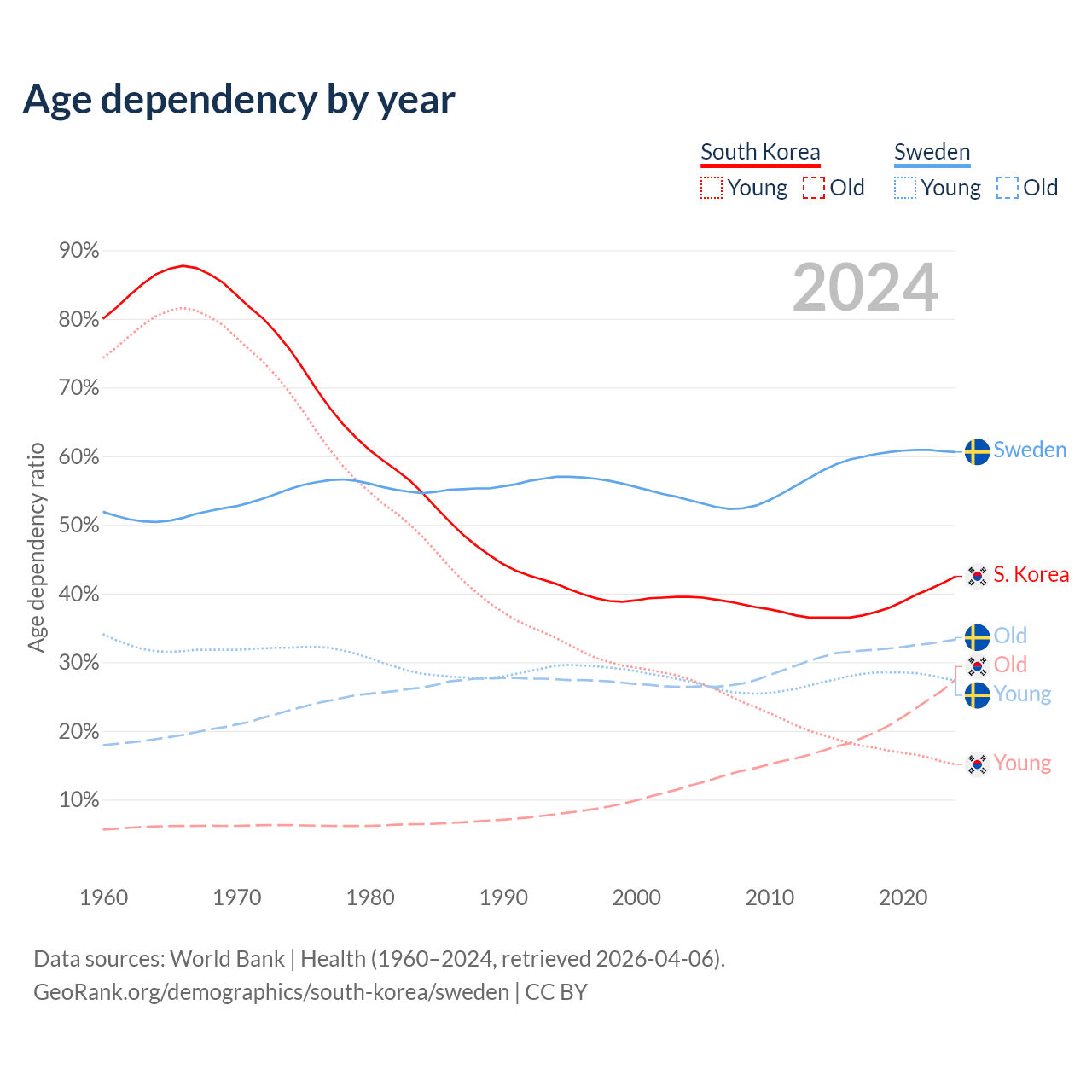 - South Korea is ranked 10/196 by median age (oldest to youngest) vs 39/196 for Sweden.