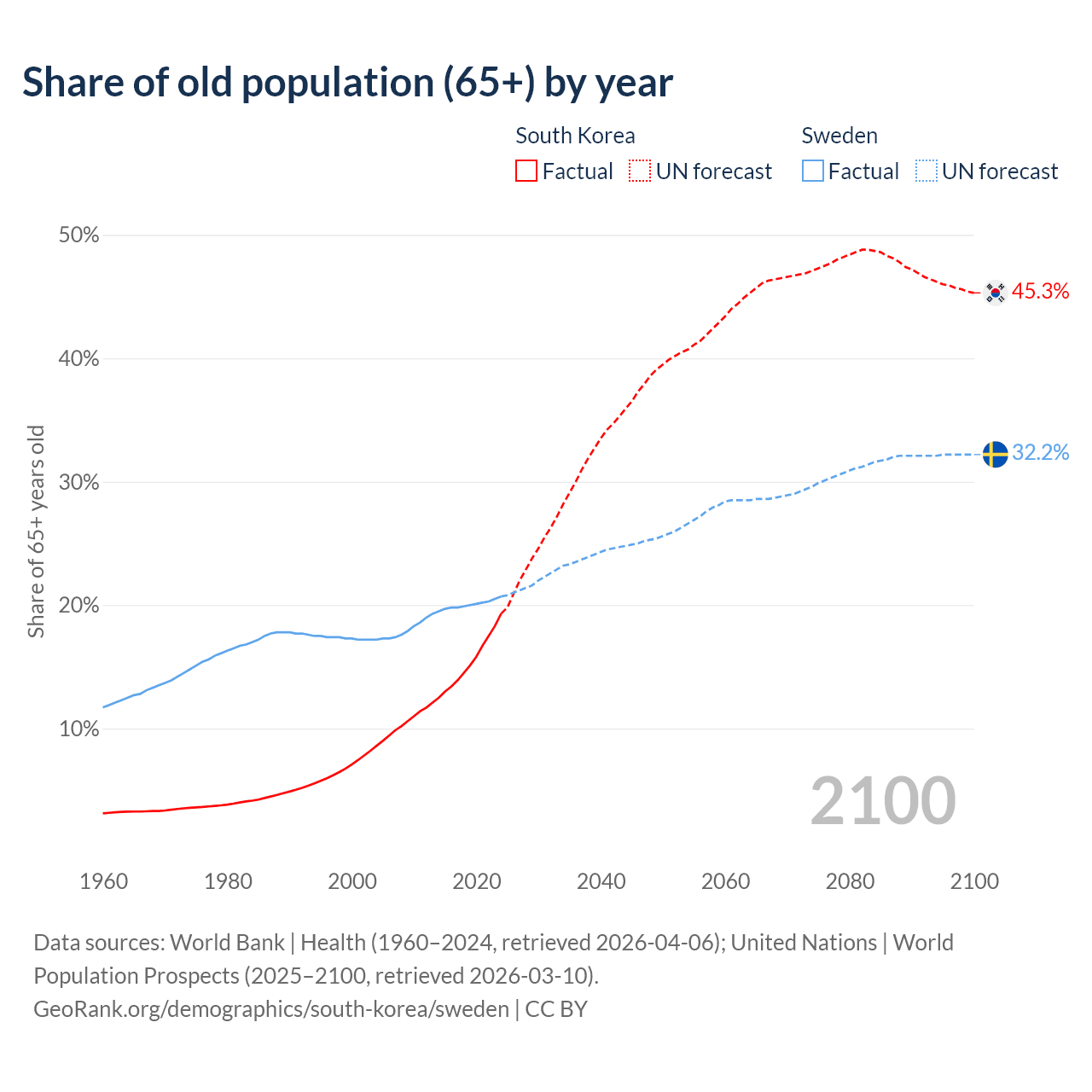 The share of older people aged 65 and over is 19.3% in South Korea and 20.7% in Sweden. Life expectancy in South Korea compared to Sweden .