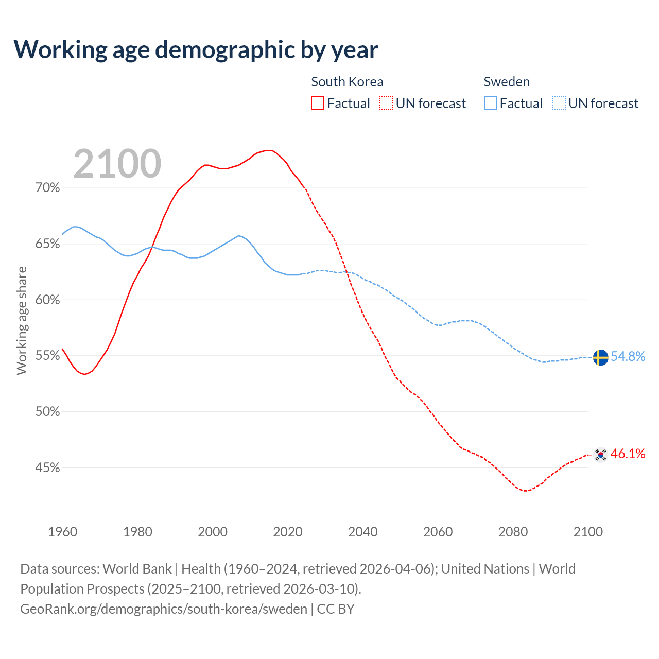 - South Korea has 36.2M working age adults (aged 15-64) vs 6.65M in Sweden.