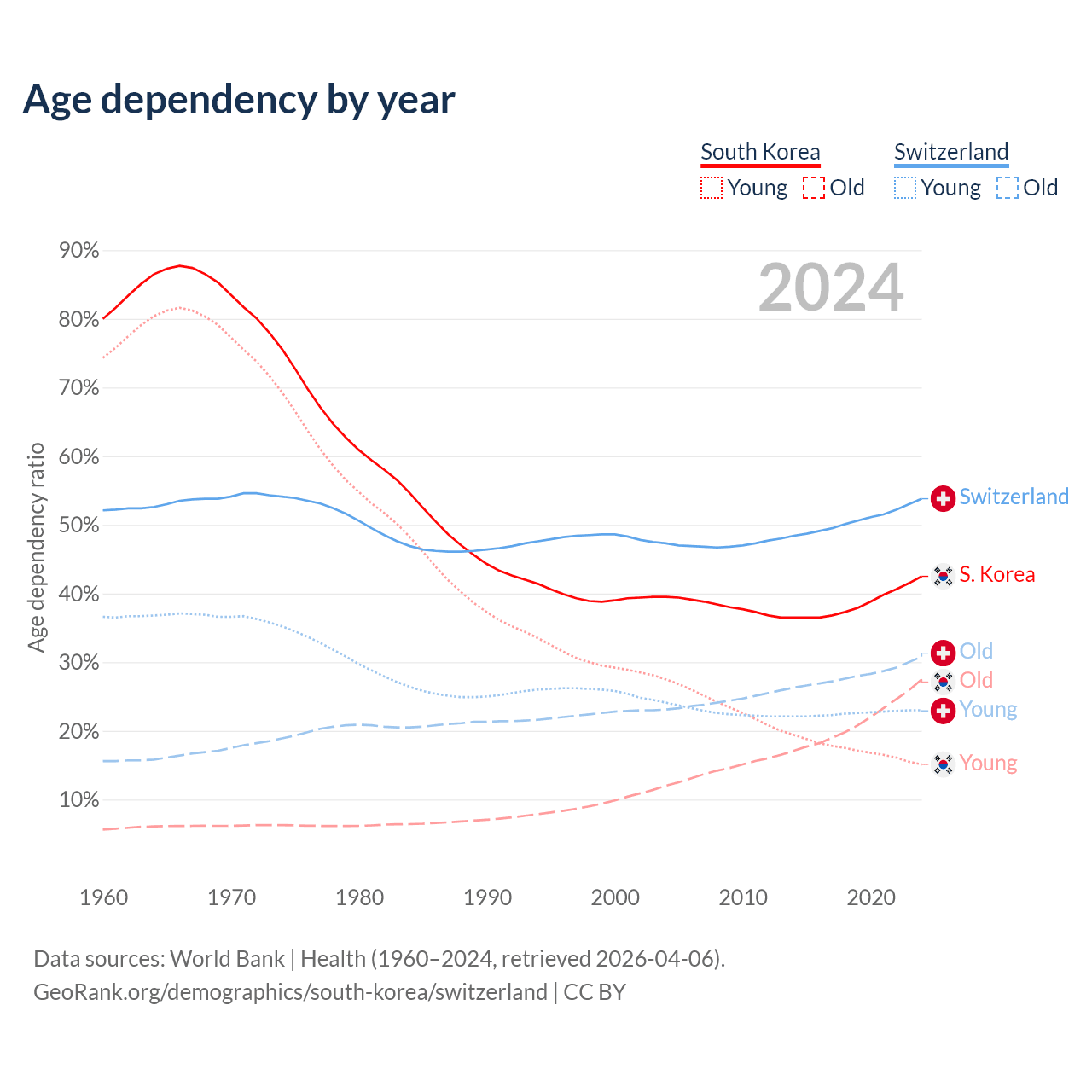 The share of older people aged 65 and over is 19.3% in South Korea and 20% in Switzerland. Life expectancy in South Korea compared to Switzerland .