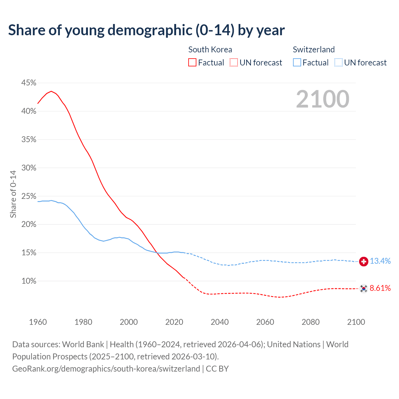- The share of young demographic (0-15 years old) in South Korea is 10.6% vs 15% in Switzerland.