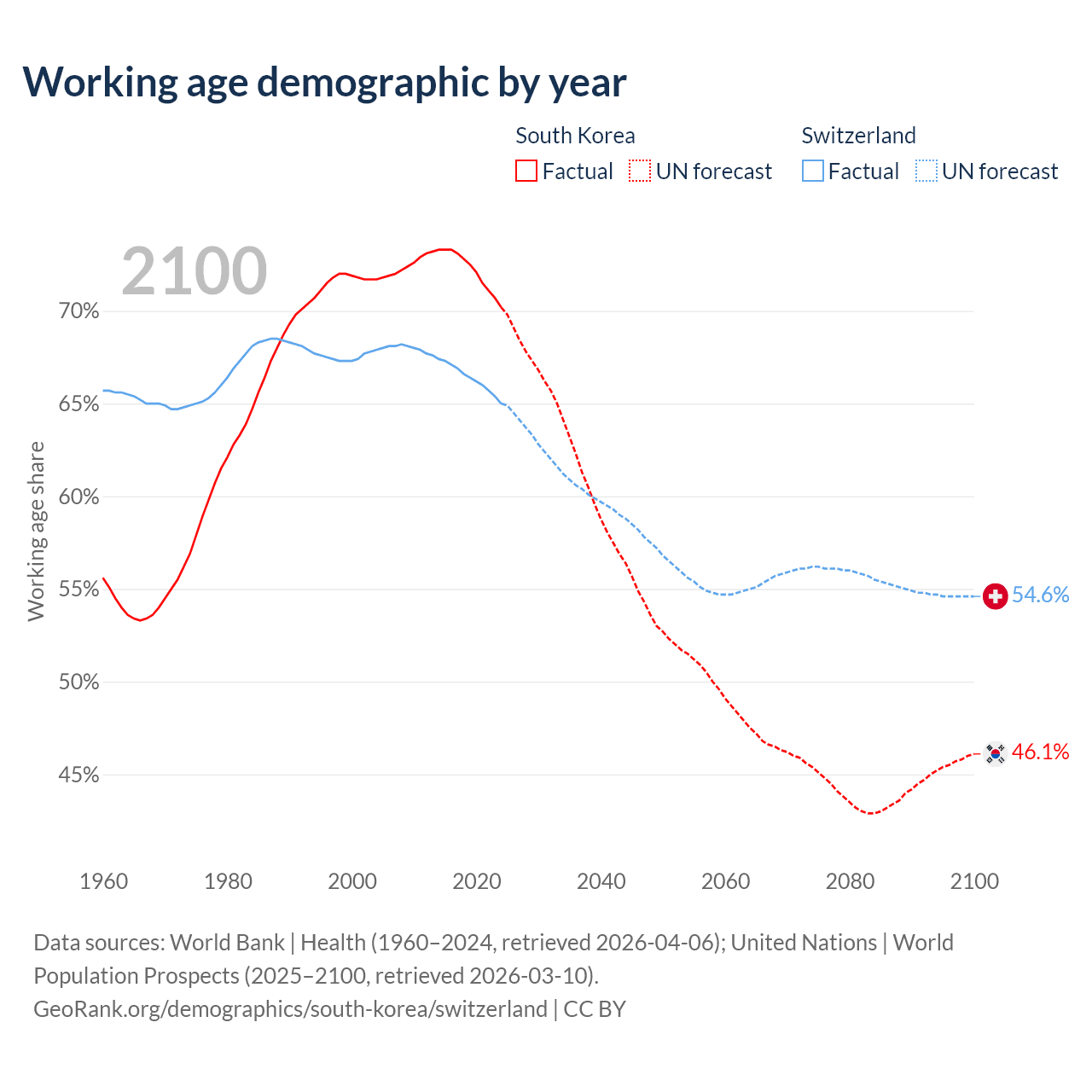 Median age South Korea vs Switzerland, 1960-2100