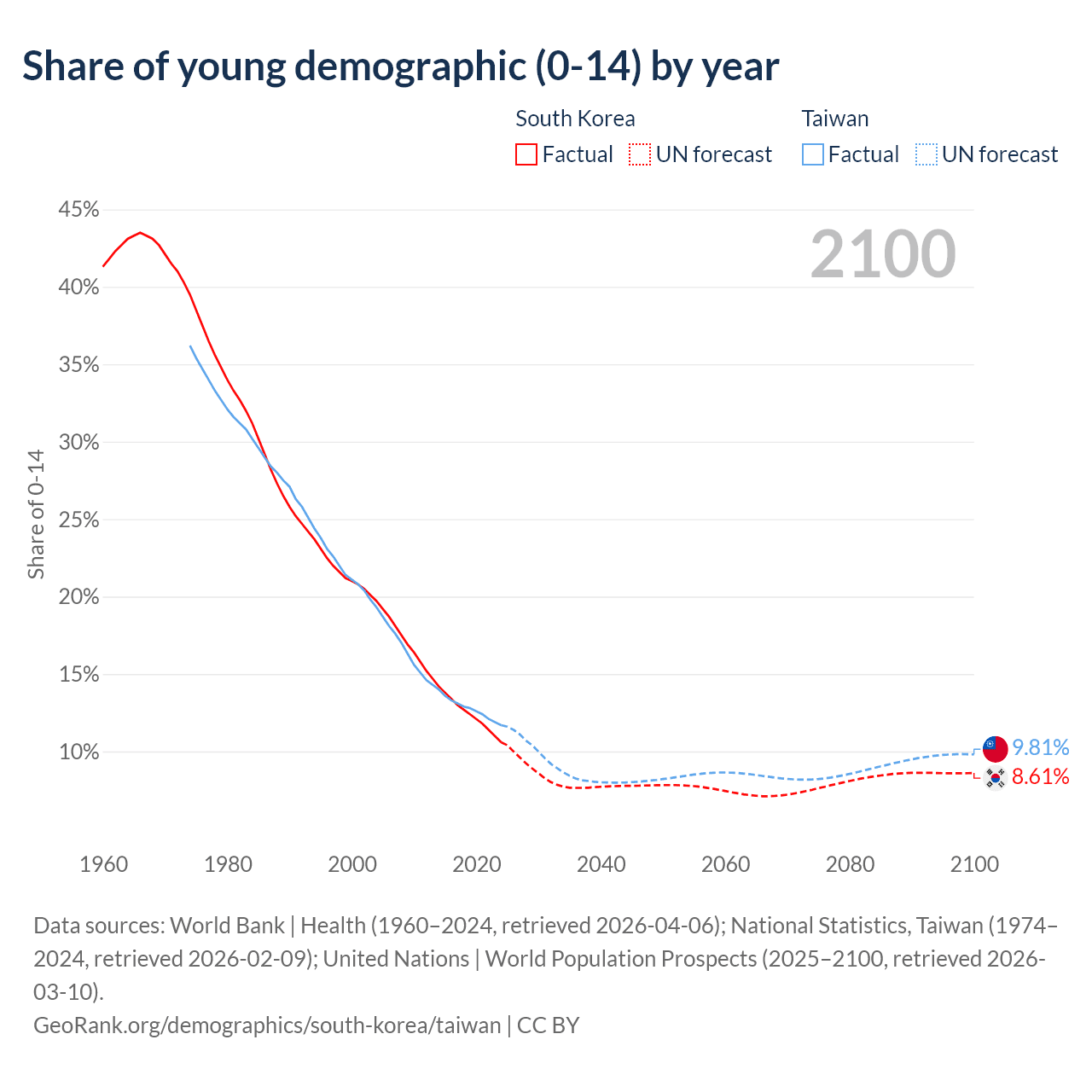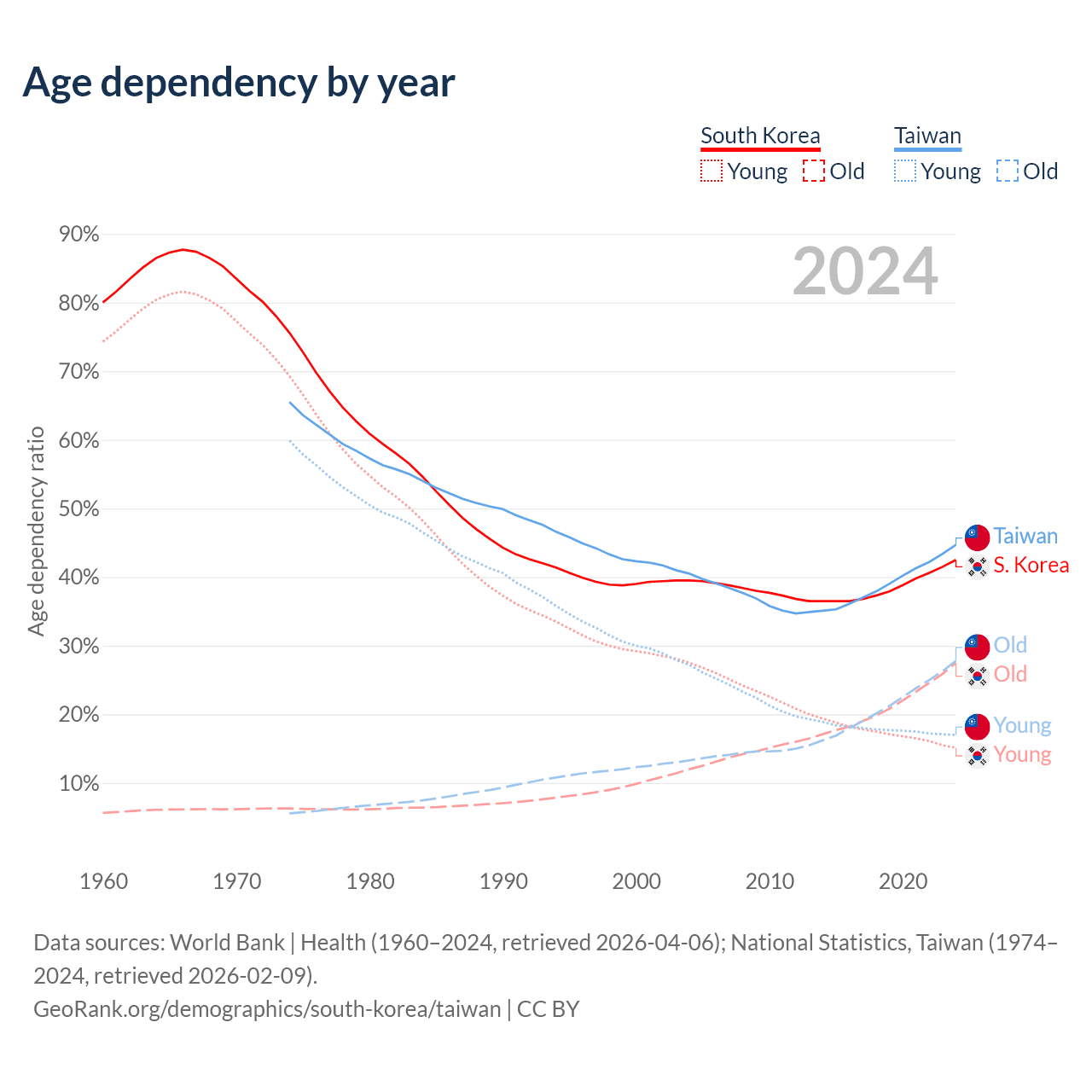 Data sources: World Bank | Health (1960–2024, retrieved 2026-04-06); U.S. Census Bureau (1960–2024, retrieved 2026-02-08); National Statistics, Taiwan (1974–2024, retrieved 2026-02-09).