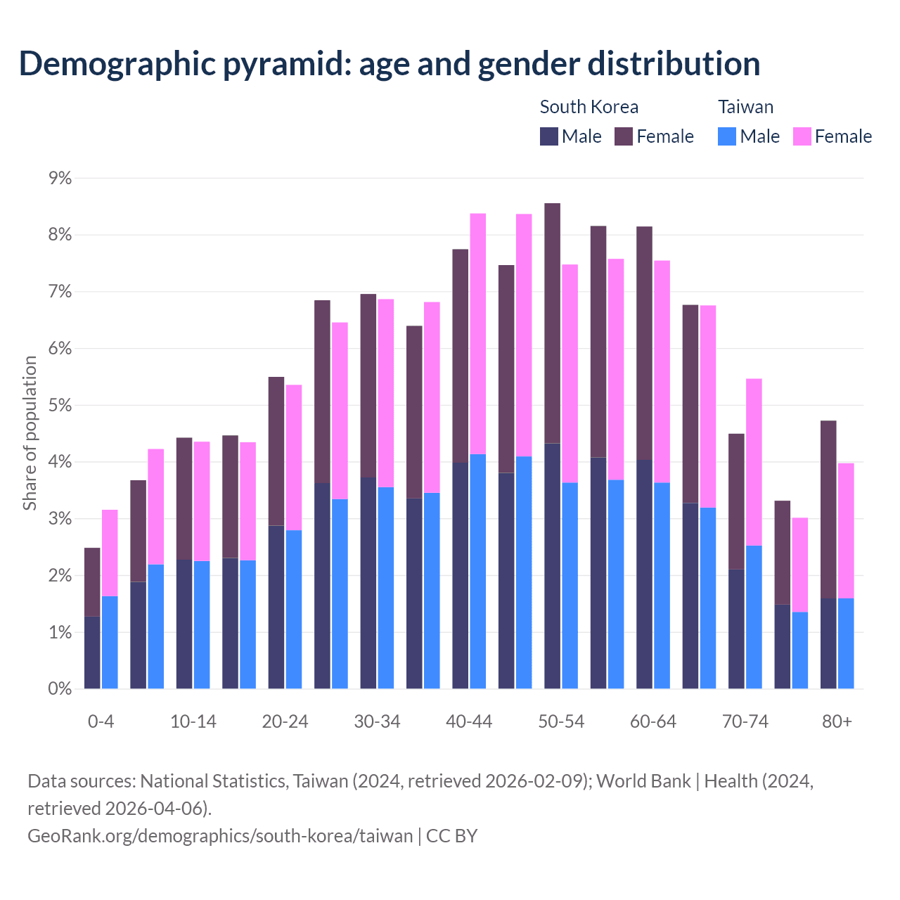 - South Korea is ranked 10/196 by median age (oldest to youngest) vs 16/196 for Taiwan.