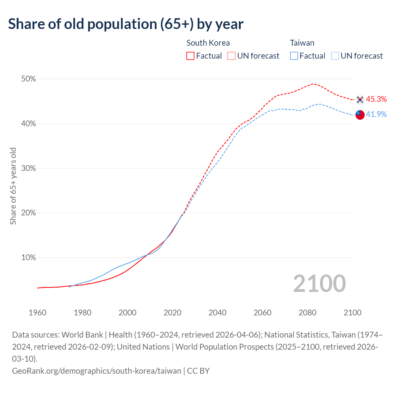 The share of older people aged 65 and over is 19.3% in South Korea and 19.2% in Taiwan. Life expectancy in South Korea compared to Taiwan .