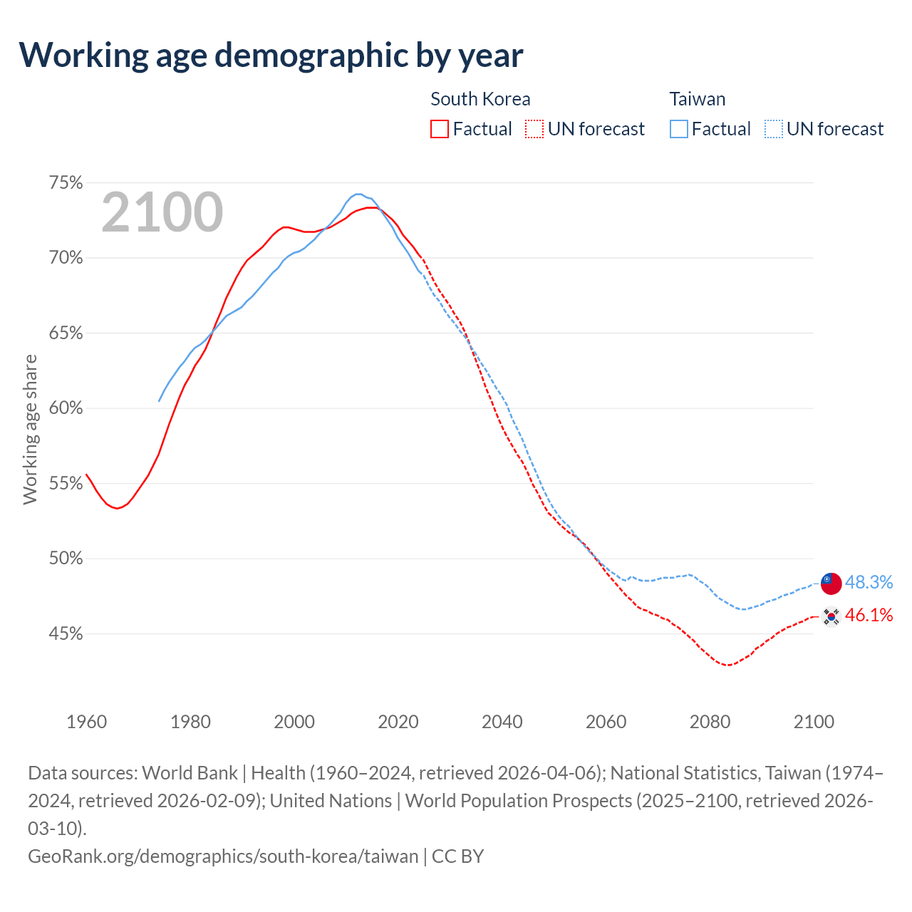 - South Korea has 36.2M working age adults (aged 15-64) vs 16.1M in Taiwan.