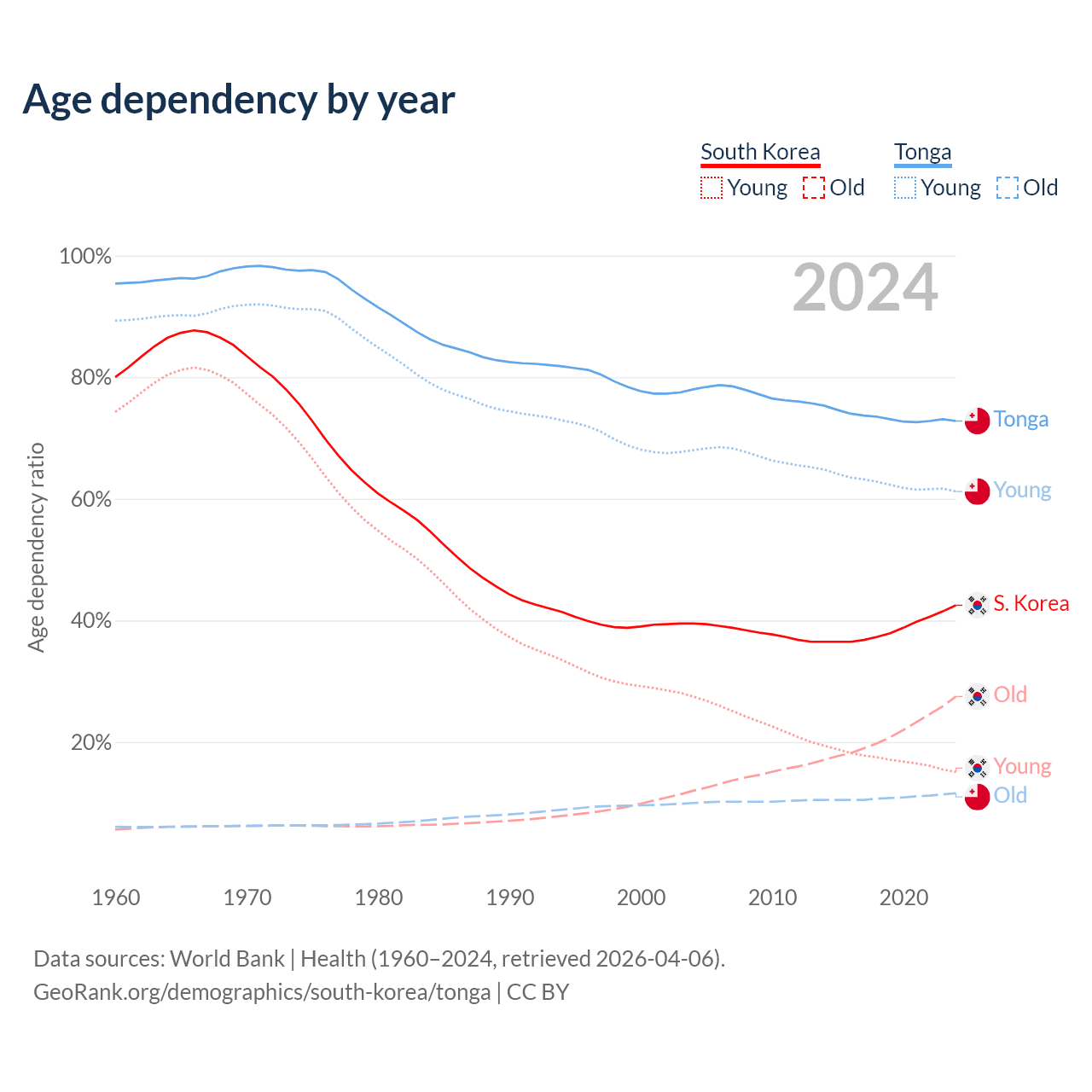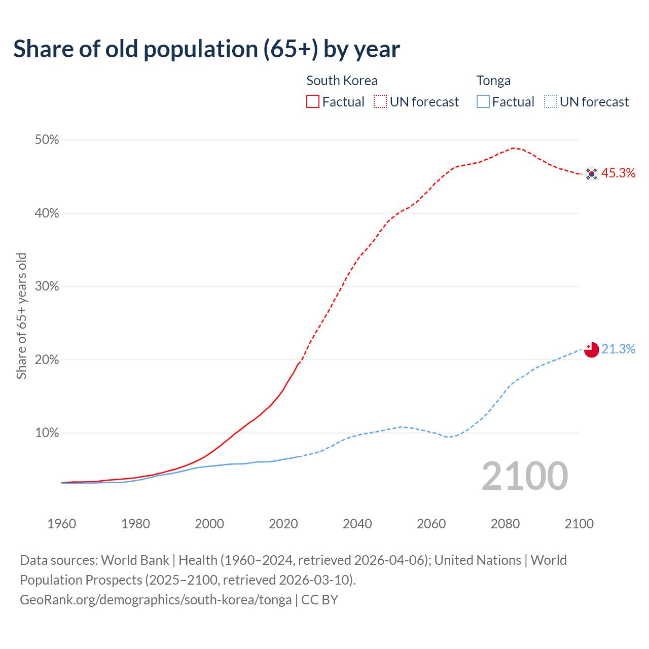 The share of older people aged 65 and over is 19.3% in South Korea and 6.72% in Tonga. Life expectancy in South Korea compared to Tonga .