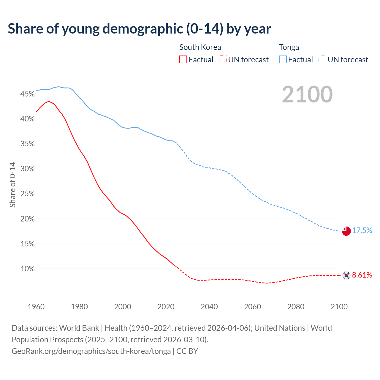 - The share of young demographic (0-15 years old) in South Korea is 10.6% vs 35.4% in Tonga.